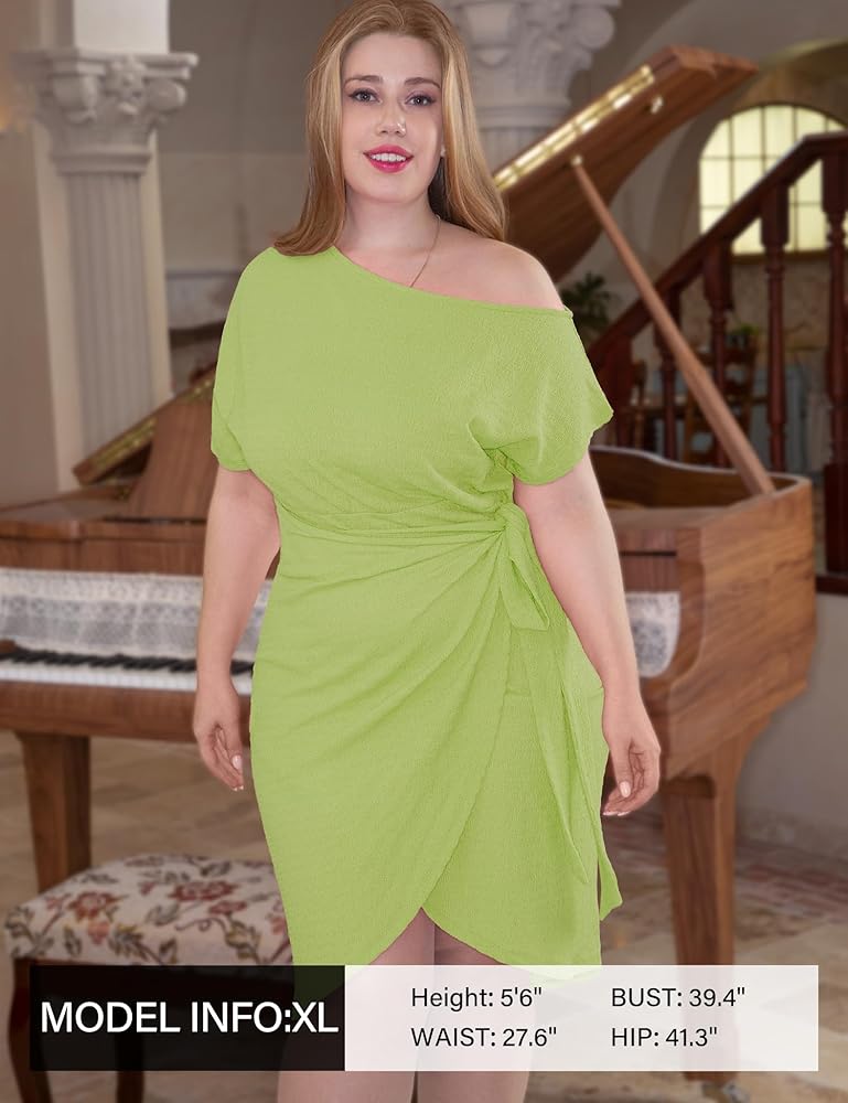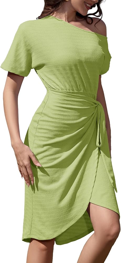 تصميمات لافتة للنظر - فستان حفلات بكتف واحد، وأكمام قصيرة، صدرية مكشكشة، خصر مرن، تصميم نحيف ملفوف على الأرداف، فستان على شكل فيونكة، حاشية عالية منخفضة، طول متوسط، فستان ضيق مثير للنساء