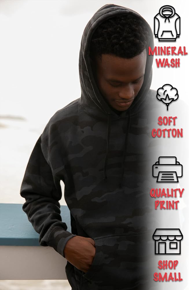 قمصاننا ذات القلنسوة المموهة المصممة بشكل جميل تأتي في مجموعة متنوعة من الألوان. الألوان الأردواز والمريمية هي 80% قطن و20% بوليستر بينما الباقي 75% قطن و25% بوليستر. أنها تأتي مع جيب أمامي وحماية مقنعين لرأسك.