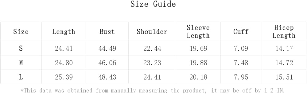 S:Bicep Length:14.2IN,Bust:44.5IN,Cuff:7.1IN,Length:24.4IN,Shoulder:22.4IN,Sleeve Length:19.7IN