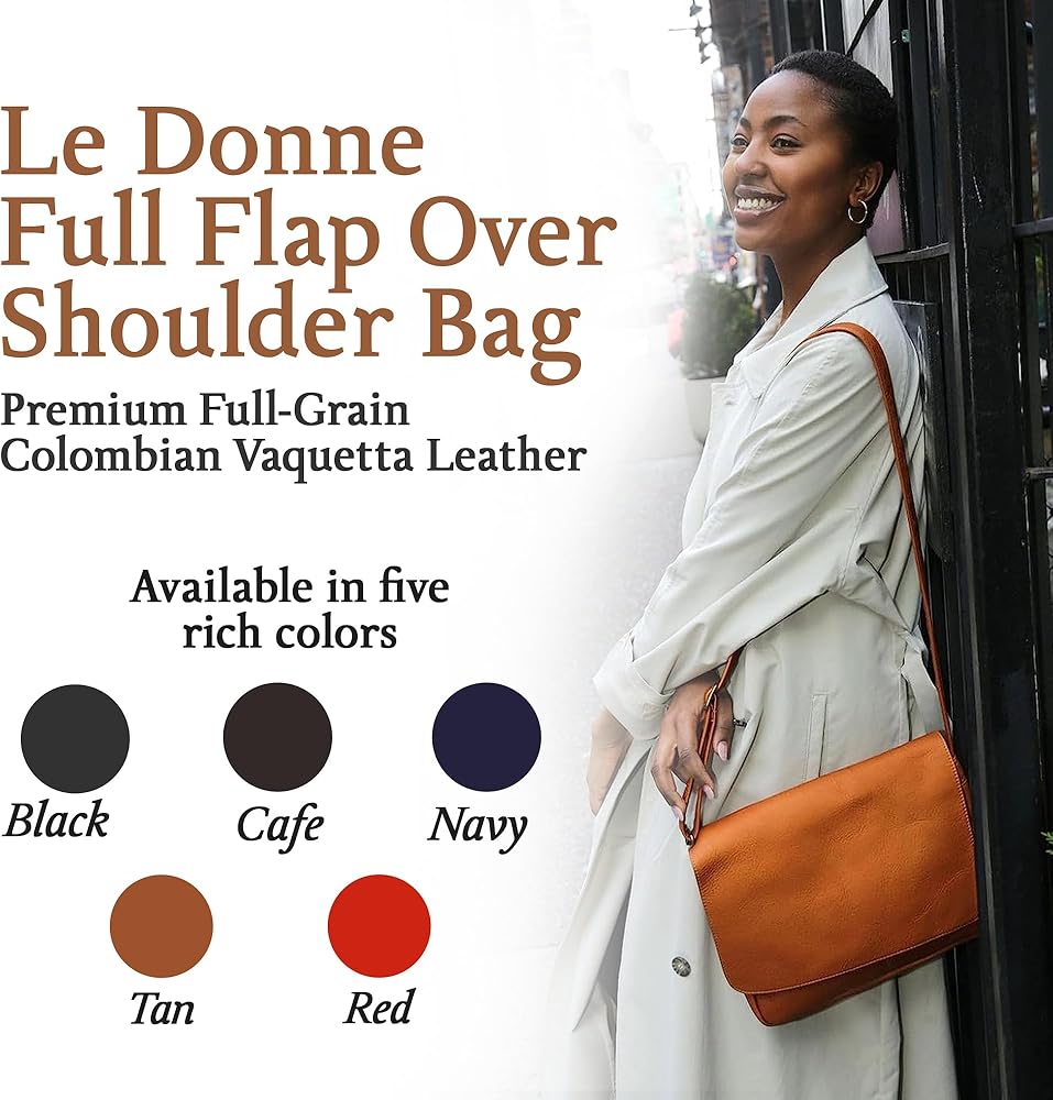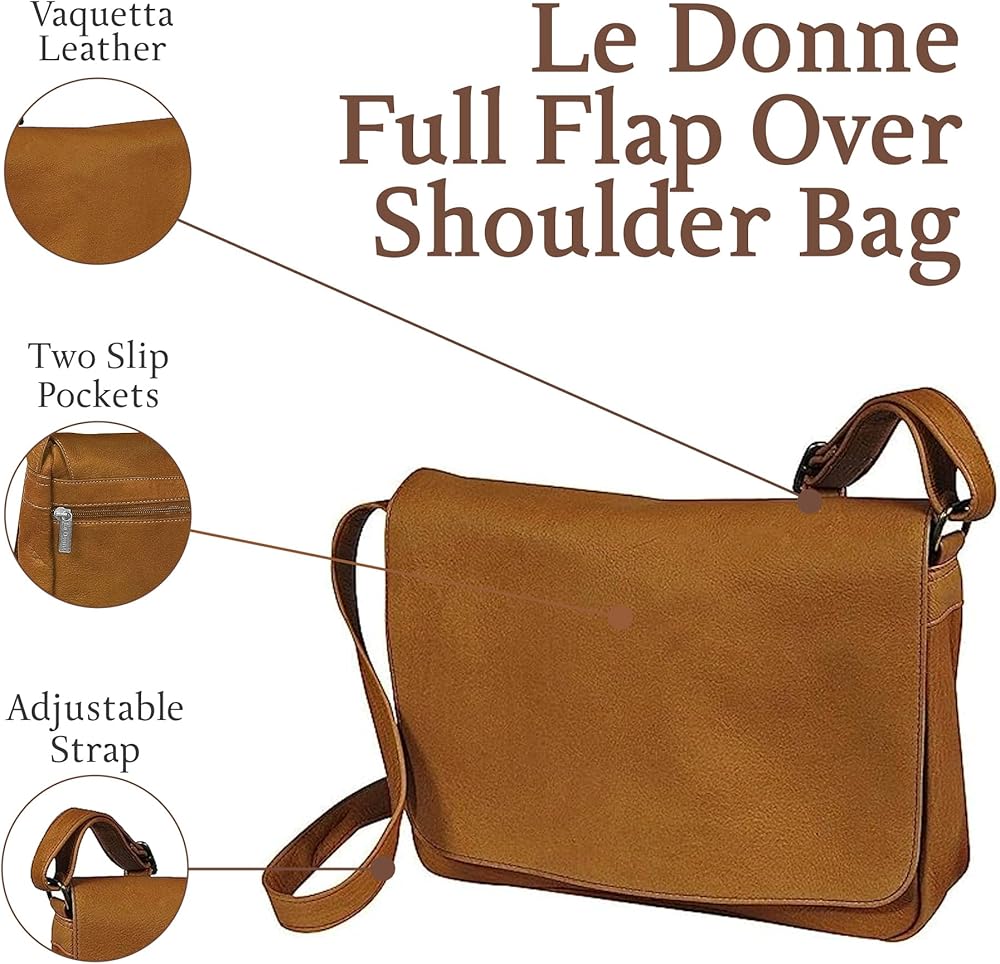 This contemporary styled Le Donne Leather Full Flap Over Leather Shoulder Bag is one of our most popular. It's a perfect leather bag for everyday or casual night out. This supple full-grain Vachetta cowhide leather bag features flap over construction and a sleek, classic design; and it's available in several colors. Its spacious, lined interior contains a zippered back wall compartment for keeping valuables safe and secure; a cell phone slide pocket; a slide pocket perfect for holding your note pad or favorite electronic device; and plenty of room for your daily necessities. An exterior zip pocket provides additional storage space, and the Le Donne Leather Flap Over Shoulder Bag comes with an adjustable shoulder strap for your carrying comfort.