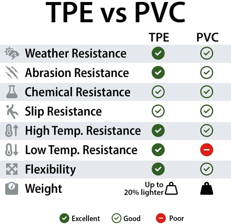 - TPE قوي: أخف وزنًا من PVC، وهو أفضل ضد المواد الكيميائية ودرجات الحرارة الشديدة والكشط