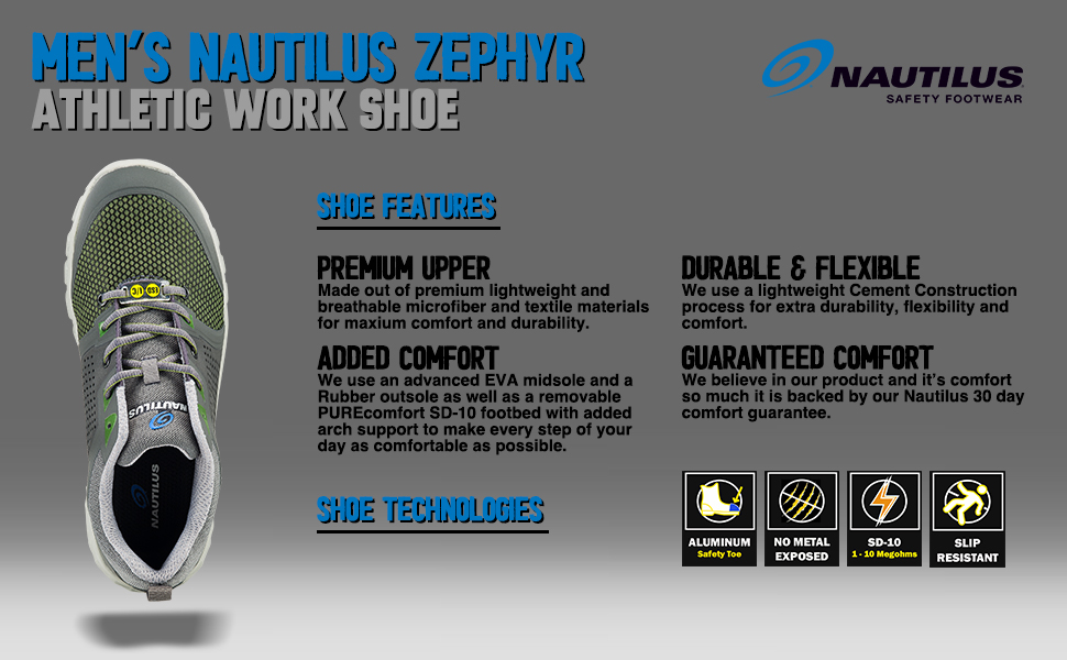ADDED COMFORT - This Nautilus Zephyr work shoe uses a rubber outsole, removable SD-10 footbed and added arch support to make every step more comfortable