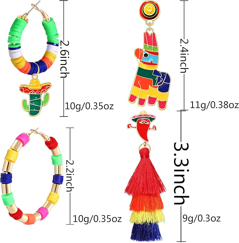 سوف تحصل على 4 أزواج من أقراط سينكو دي مايو المكسيكية الجميلة جدًا. يمكنك الحصول على الكثير من الطرق المتطابقة، لا يمكنك ارتداؤها فقط في سينكو دي مايو ولكن أيضًا في حفلة ذات طابع مكسيكي، ميكسيكنا فييستا، يوم الموتى المكسيكي، حفلة حمام السباحة أو مناسبة للحفلات الأخرى، ستكون جميعها إكسسوارًا نادرًا يدعم مزاجك.
