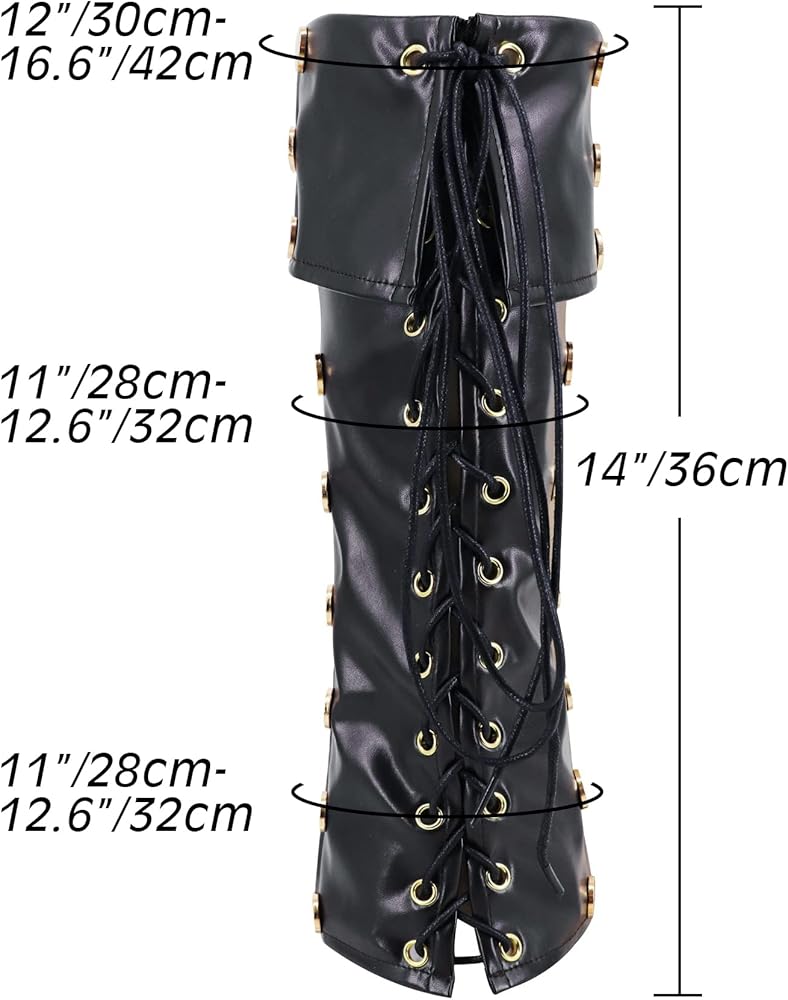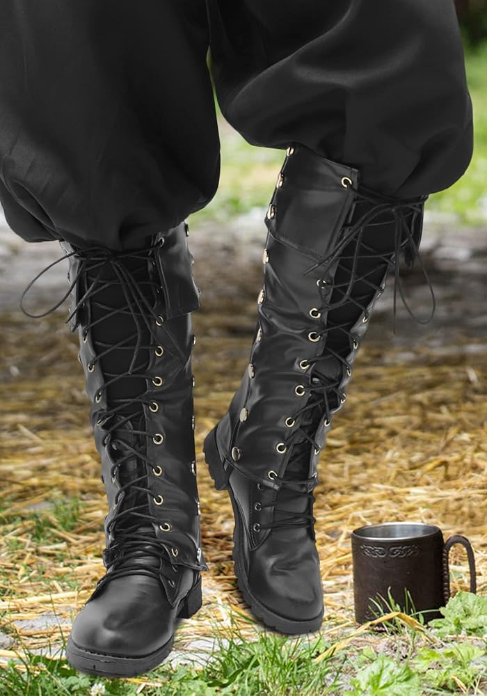 المقاس: هذا الحذاء ذو الرقبة القرصان للرجال له مقاس واحد فقط، ولكن يمكن تعديل الأربطة لتناسب الرجال تقريبًا. محيطه العلوي حوالي 12 بوصة - 16 بوصة، محيط الوسط حوالي 11 بوصة - 12.6 بوصة والمحيط السفلي حوالي 11 بوصة - 12.6 بوصة.