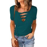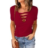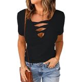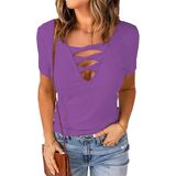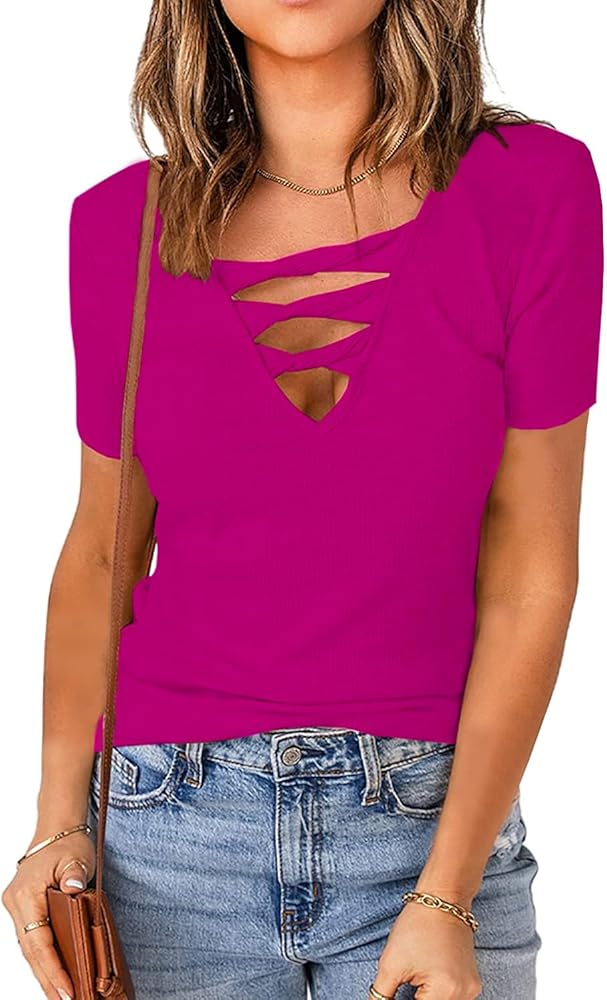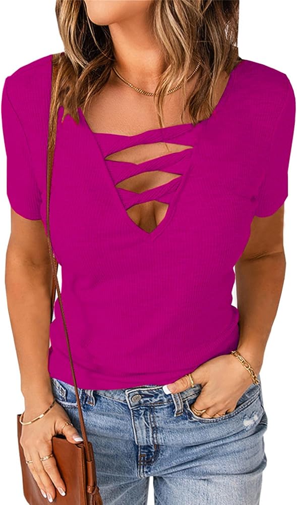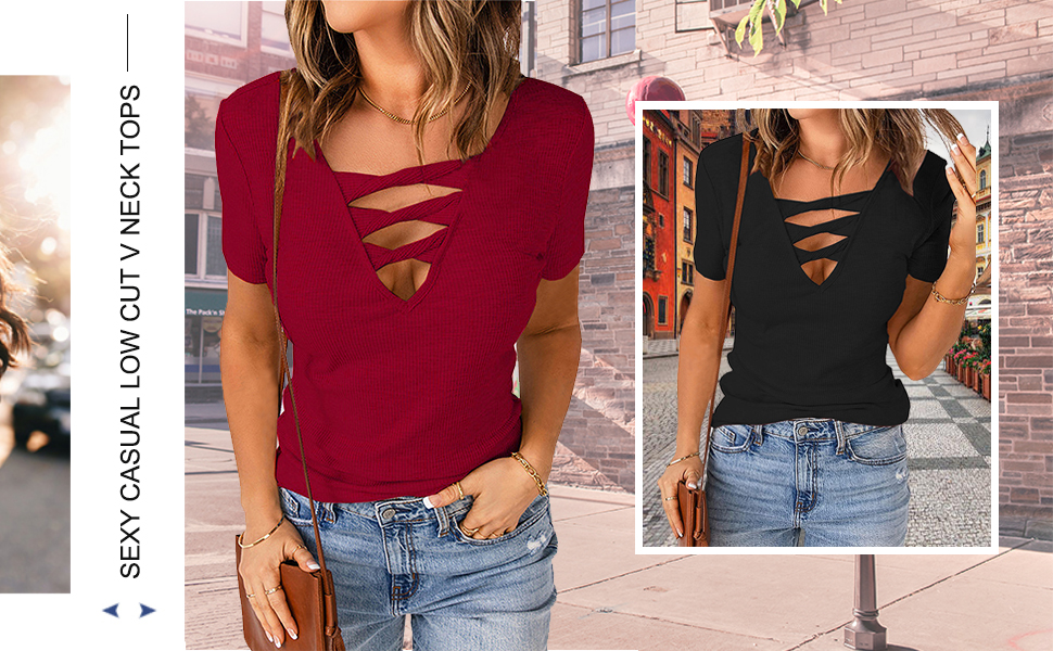- رقبة على شكل حرف V مثيرة منخفضة القطع، خط عنق عميق، أكمام قصيرة، نسيج مضلع، قمصان أمامية متقاطعة للنساء