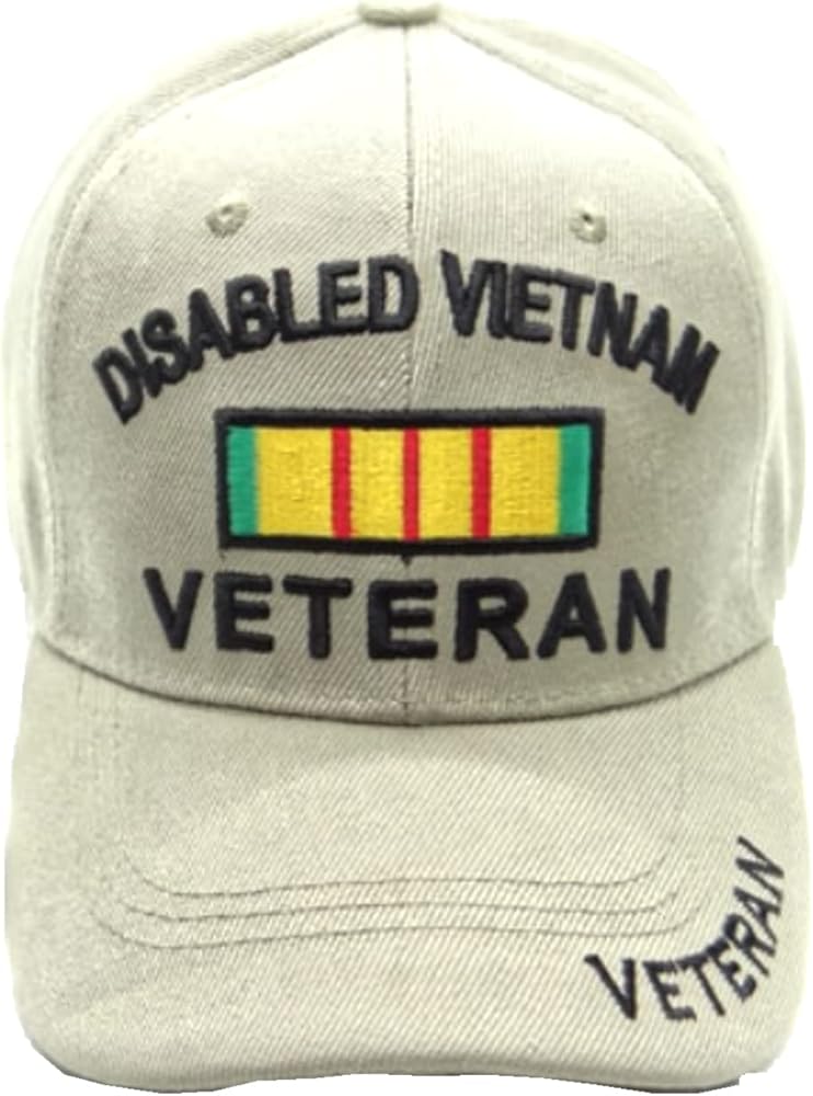 Disabled Vietnam Veteran (Ribbon) (Veteran on bill) (Black Letters) Baseball Cap (Beige). Great Gift Ideas. Check our assortment of hat pins. Super gifts for birthday, anniversary, Christmas, for family, friends and yourself. Quality Stitching and Embroidery