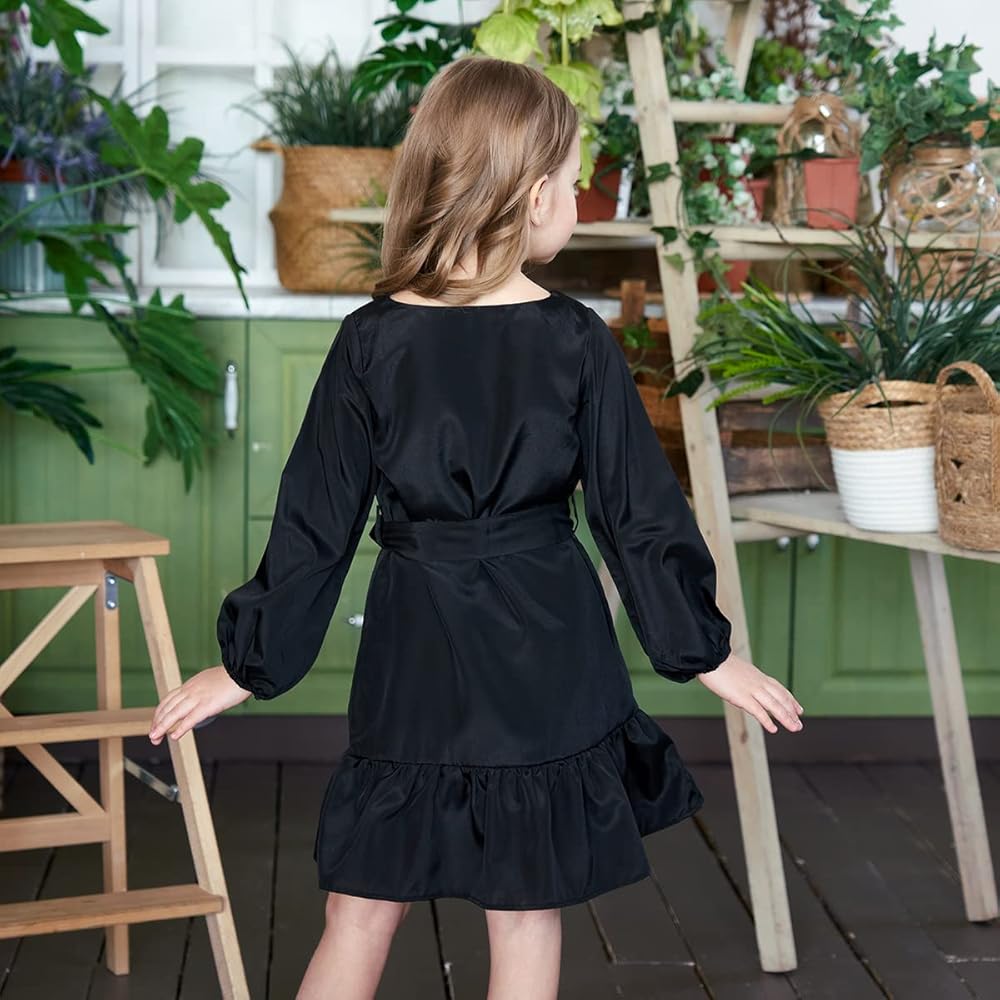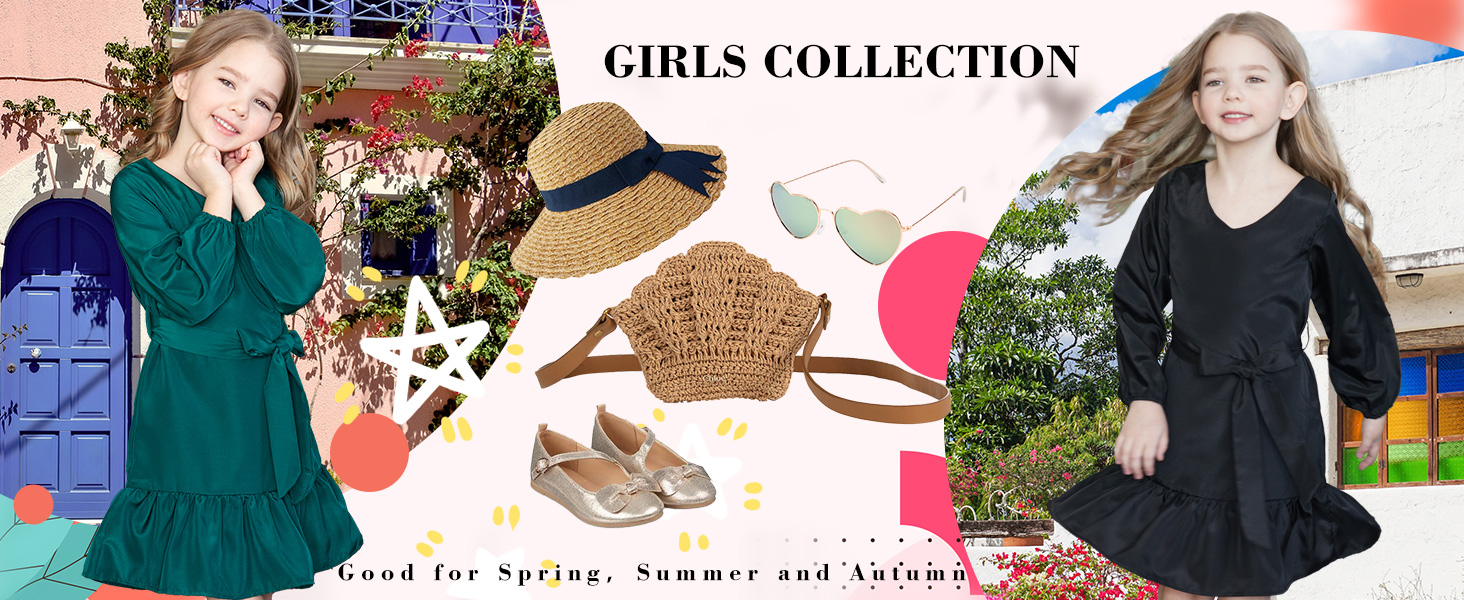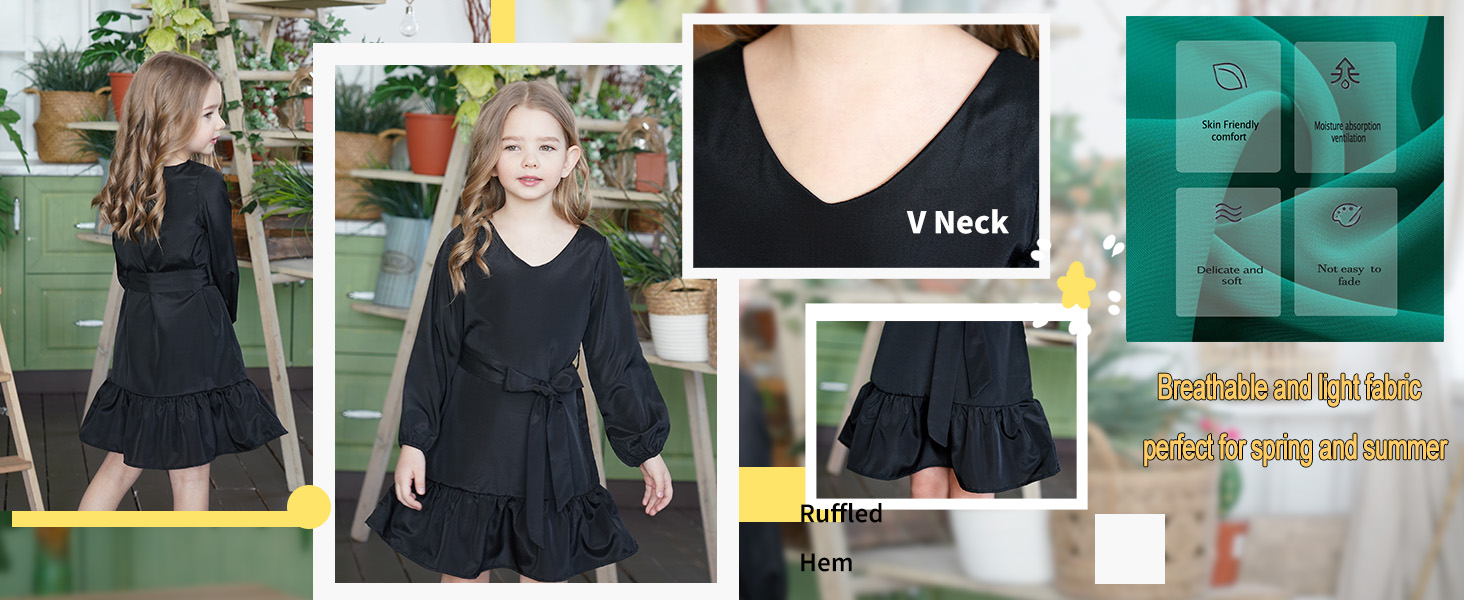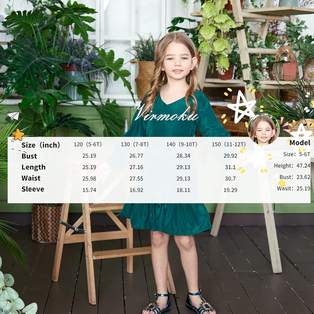 🍭 الميزات--رقبة على شكل حرف V، وأكمام طويلة منتفخة، وأكمام كبيرة الحجم، وفستان شمسي صغير، وفساتين صيفية للفتيات الصغيرات.
