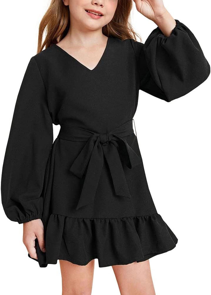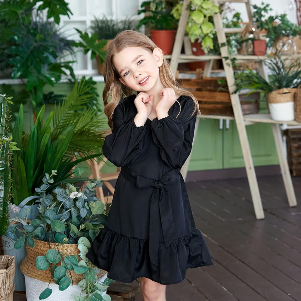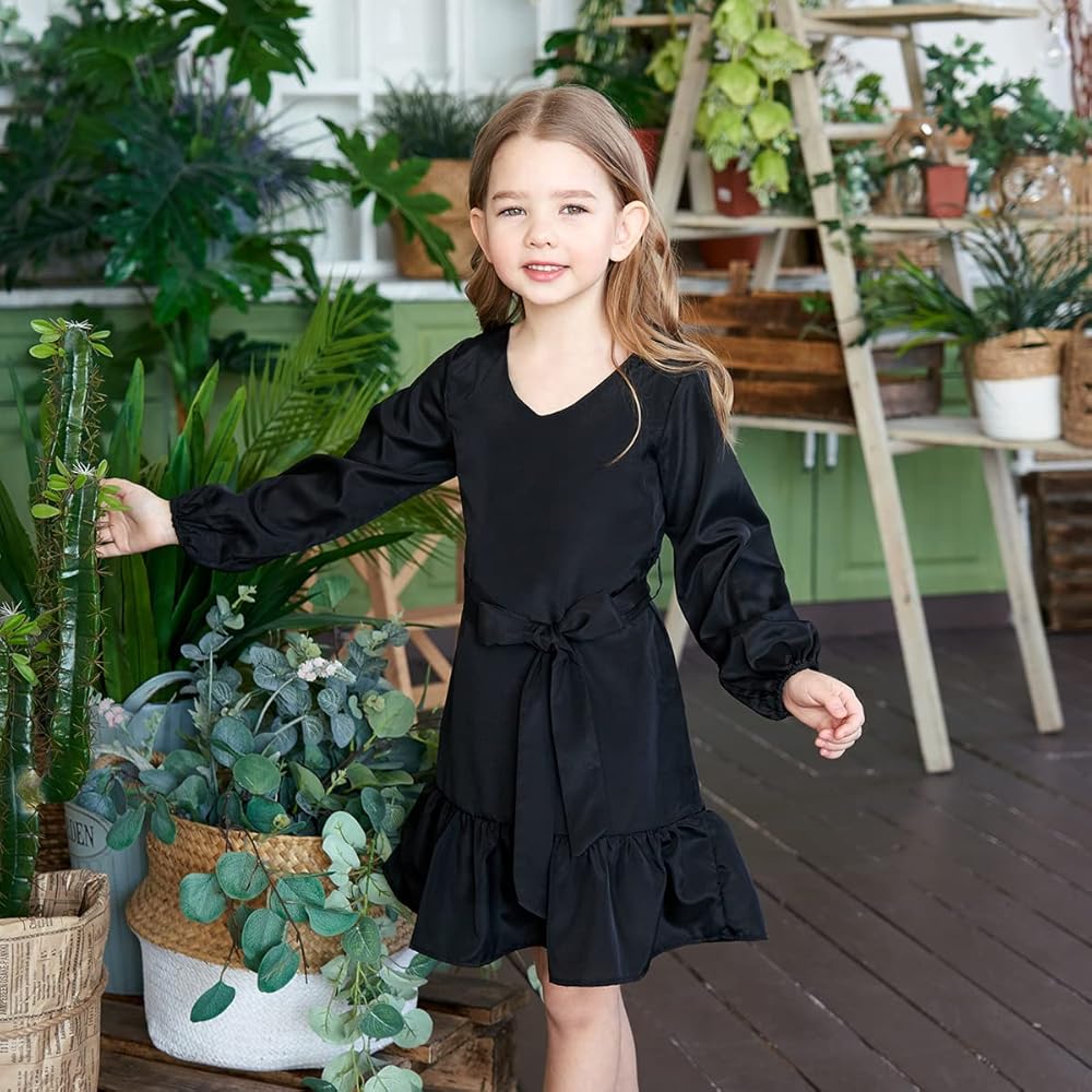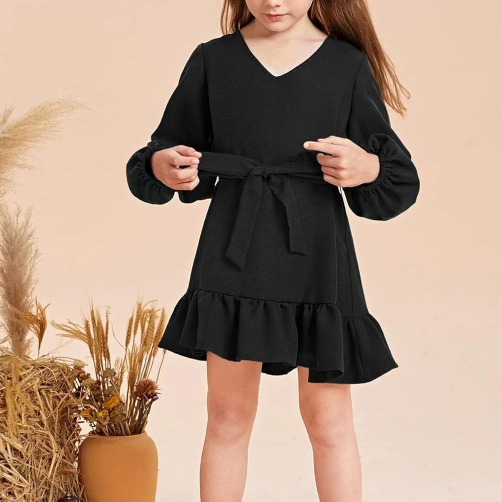 🍭 هذا الفستان ذو الطراز الكاجوال مع حزام على شكل فيونكة لطيف. كشكشة جميلة في الجزء السفلي من التنورة، أضف لمسة جميلة. أكمام طويلة تجعلك ترتديه لفترة أطول. اللون الصلب سيجعله أنيقًا.
