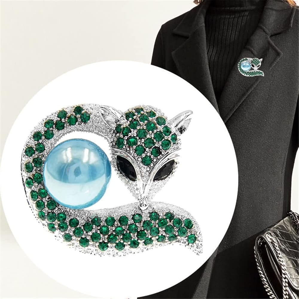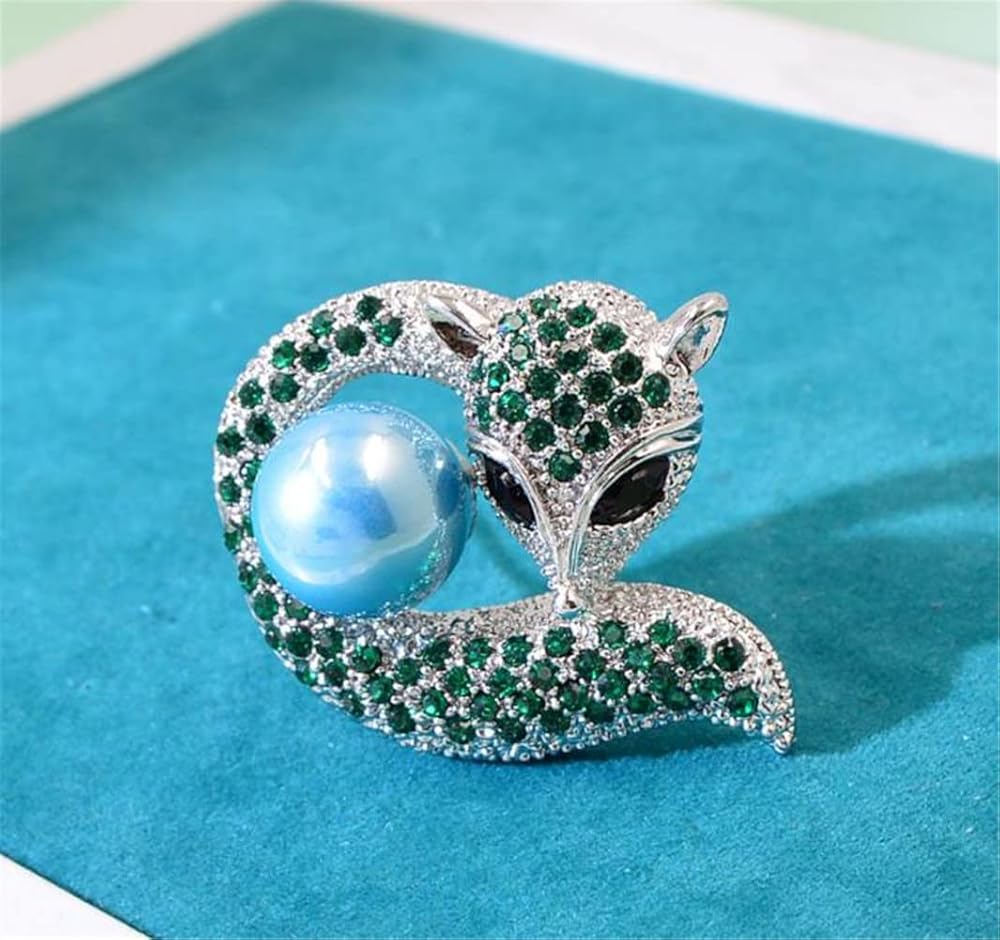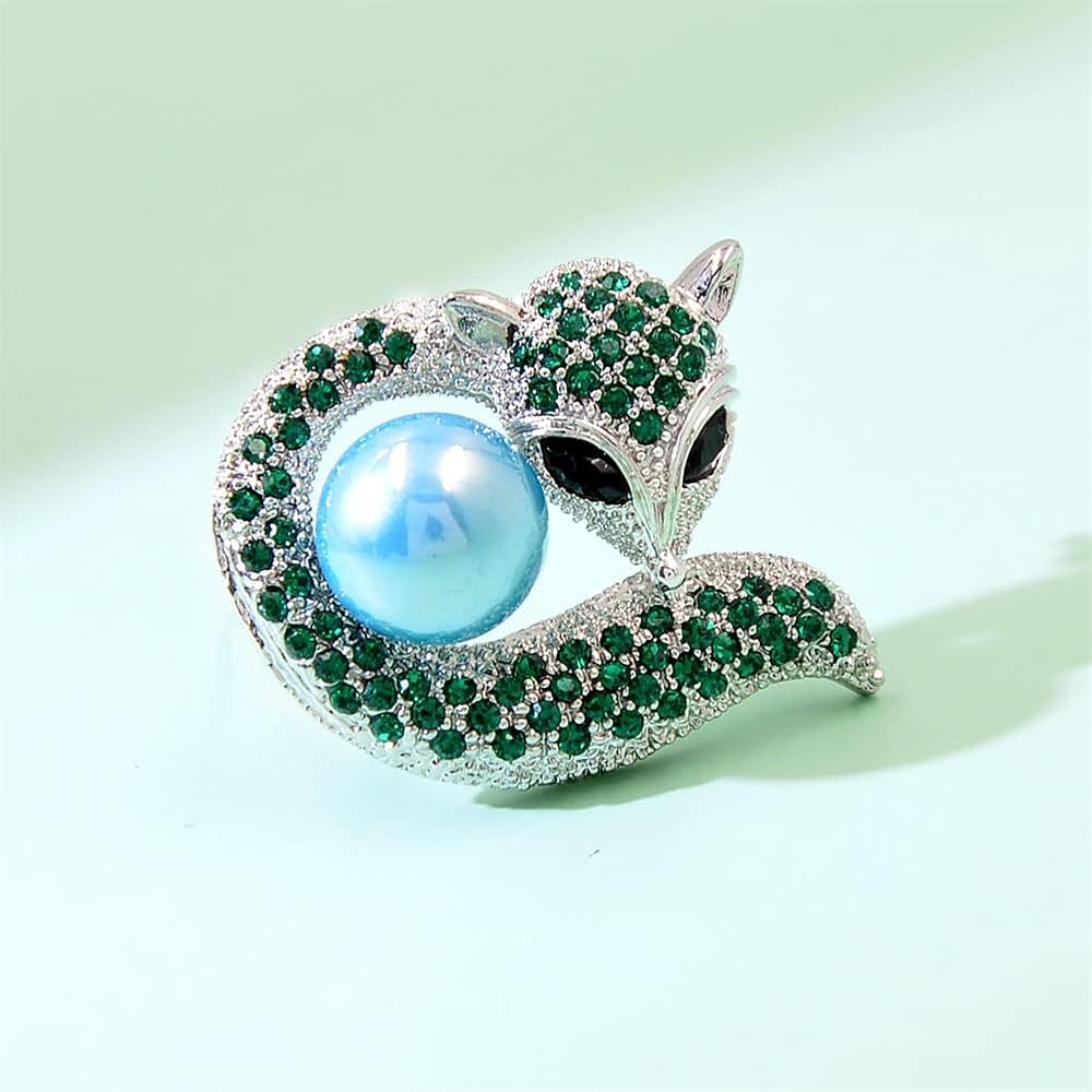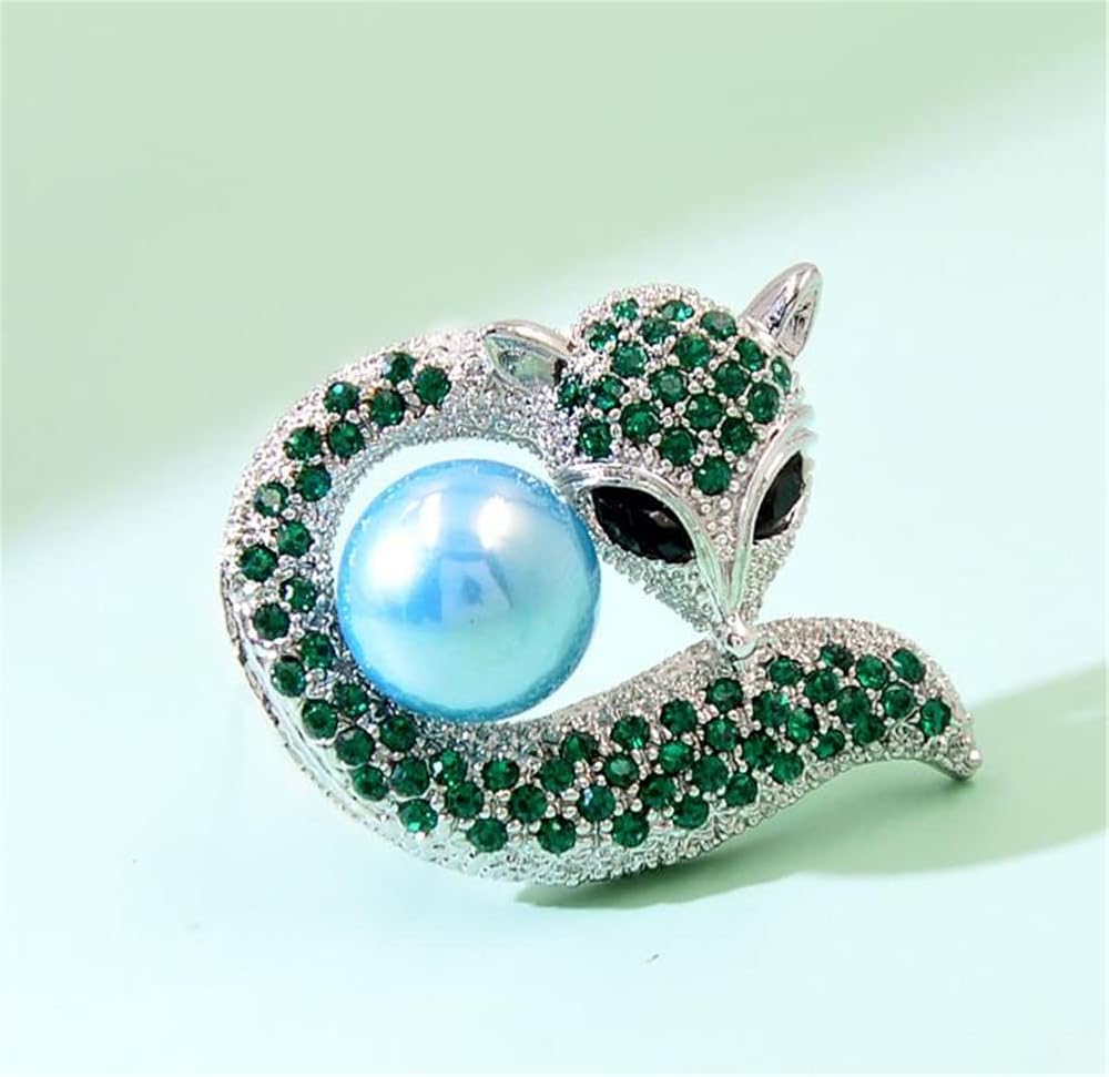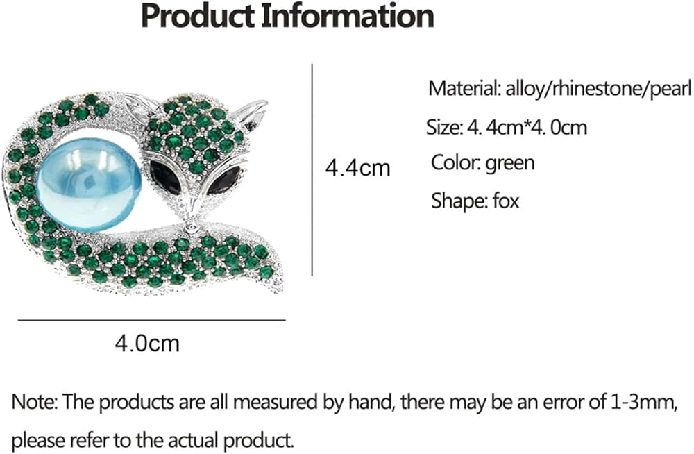 Retro cute fox brooches alloy animal pearl brooches Rhinestone jewelry corsage clothing accessories anti-glare fashion clothing accessories silk scarf buckle accessories Material: alloy/rhinestone/pearl Size: 4. 4cm*4. 0cm Color: green Shape: fox Note: The products are all measured by hand, there may be an error of 1-3mm, please refer to the actual product.