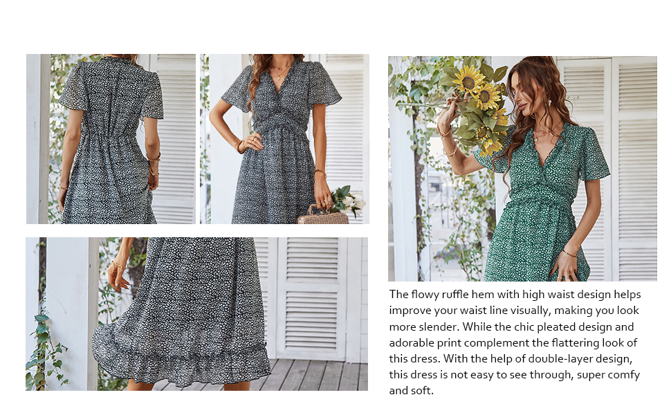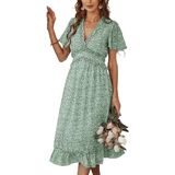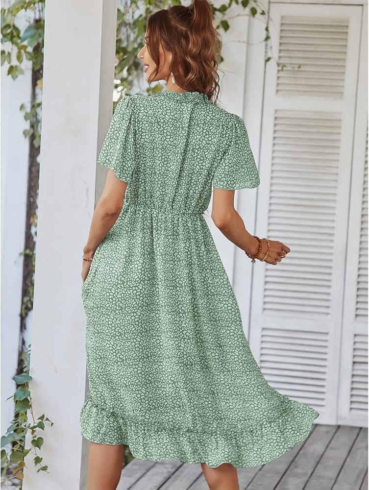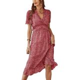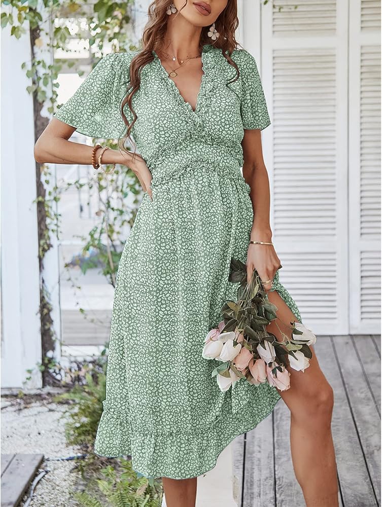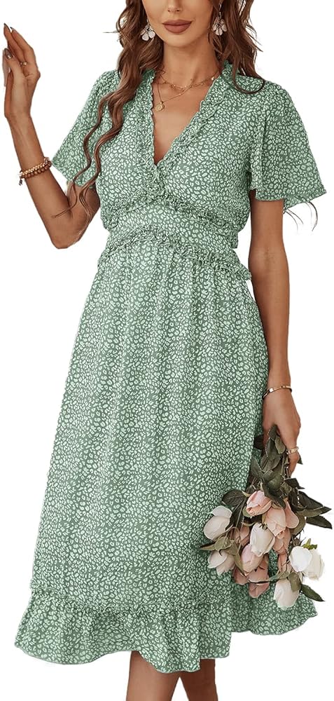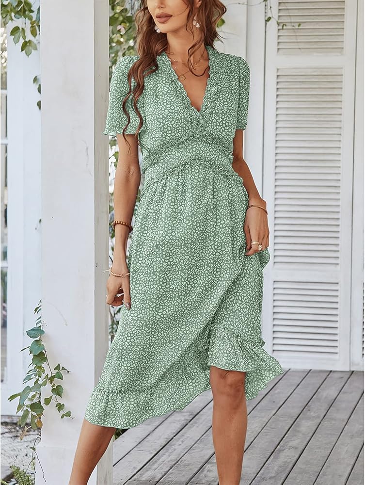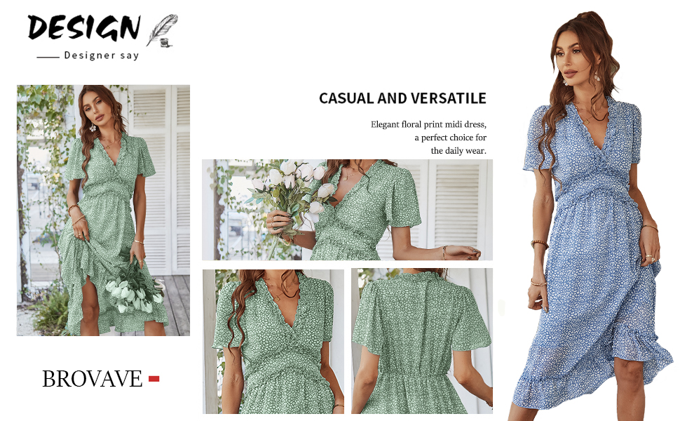 فستان نسائي من BROVAVE للربيع والصيف كاجوال بطباعة زهور وأكمام قصيرة ورقبة على شكل حرف V ومكشكش متوسط الطول