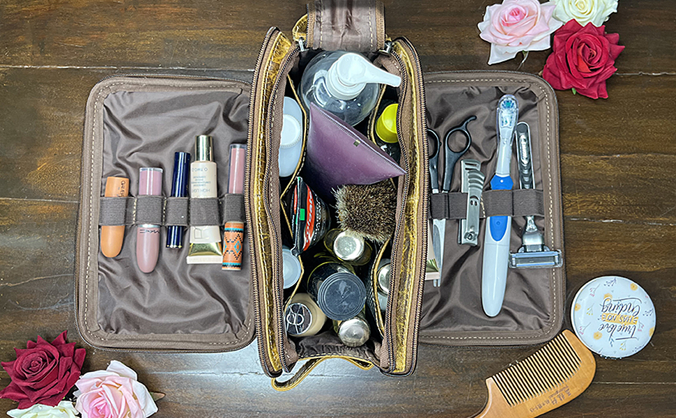 ✅ مساحات تخزين متعددة للضروريات: مع مساحة داخلية واسعة والعديد من الأقسام، تحافظ حقيبة أدوات الزينة للجنسين هذه على سهولة الوصول إلى جميع أدوات النظافة الخاصة بك. يوجد 4 جيوب شبكية منفصلة في الجدار الجانبي للحجرة الرئيسية بالإضافة إلى جيبين جانبيين قابلين للطي مع جيوب شبكية وشريط من السباندكس يمكنه حمل ما يصل إلى 5 أشياء أصغر مثل فرش الأسنان وشفرات الحلاقة التي تستخدم لمرة واحدة ومقصافة الأظافر وفرش المكياج وما إلى ذلك.
