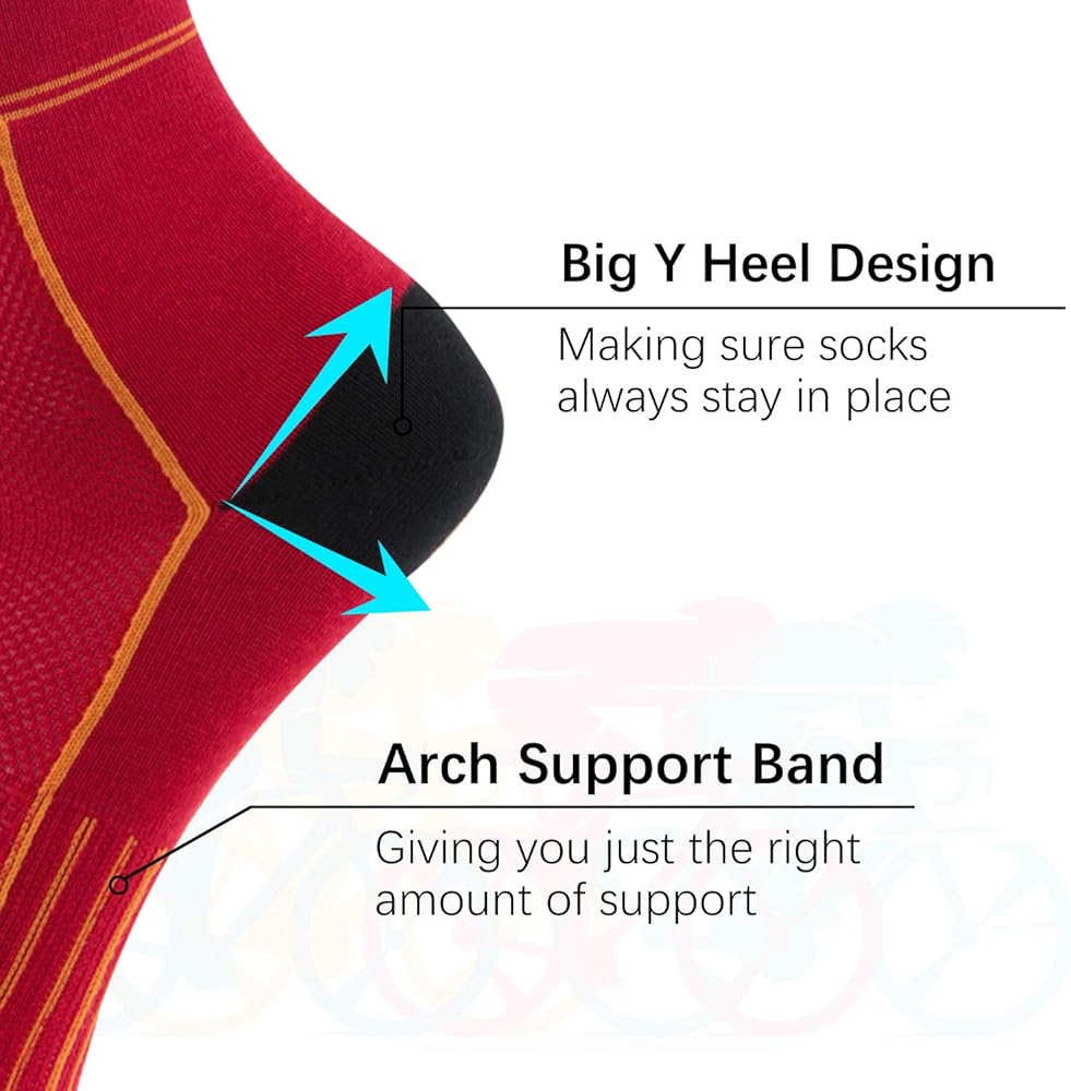 ★【تصميم كعب كبير على شكل حرف Y ومقدمة درزات مخفية】جوارب الدراجة الدائرية من لين بيرفورمانس مصنوعة بدرزات أصابع غير مرئية تقريبًا وكعب كبير ممتد على شكل حرف Y، مما يضمن بقاء الجوارب في مكانها دائمًا، مما يقلل الاحتكاك ويمنع قدميك من الإصابة بالبثور.