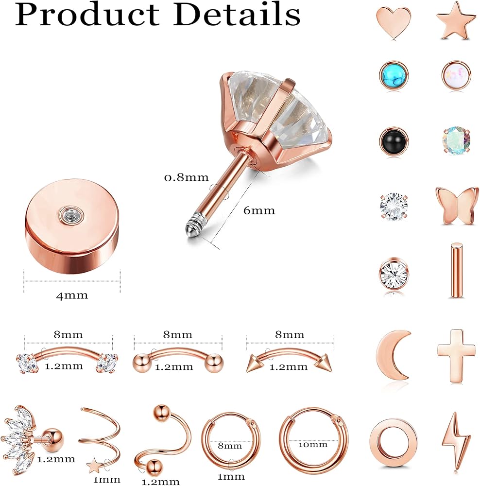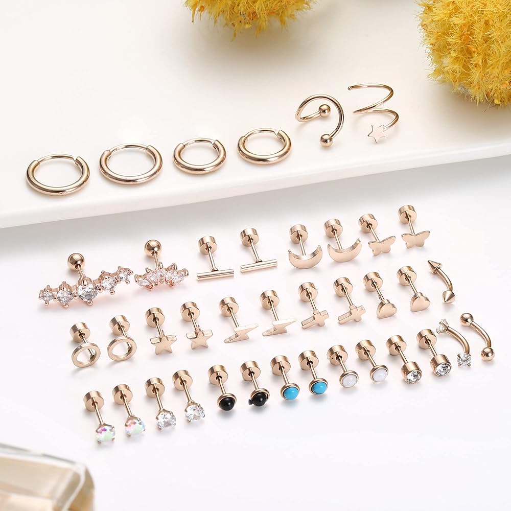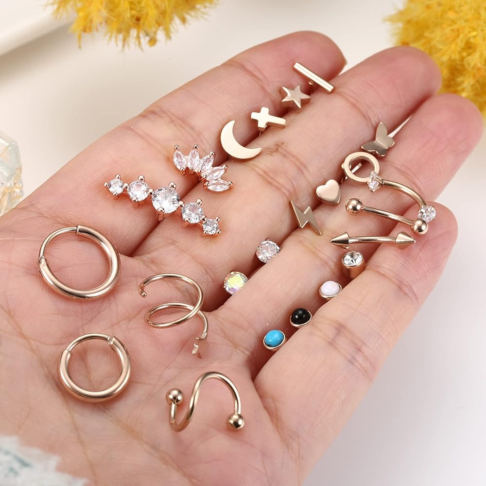 مجموعة أقراط الغضروف: مجموعة أقراط تتضمن 14 زوجًا من الأقراط الغضروفية، وزوجين من الأقراط الغضروفية، و3 قطع من الأثقال المنحنية، وقطعتين من الأقراط الحلزونية الحلزونية الملتوية، وقطعة واحدة من حلق الغضروف المنحني تشيكوسلوفاكيا وقطعة واحدة من قرط الغضروف على شكل تاج، مجوهرات ثقب الأذن المثالية لعدة أشخاص ثقب.