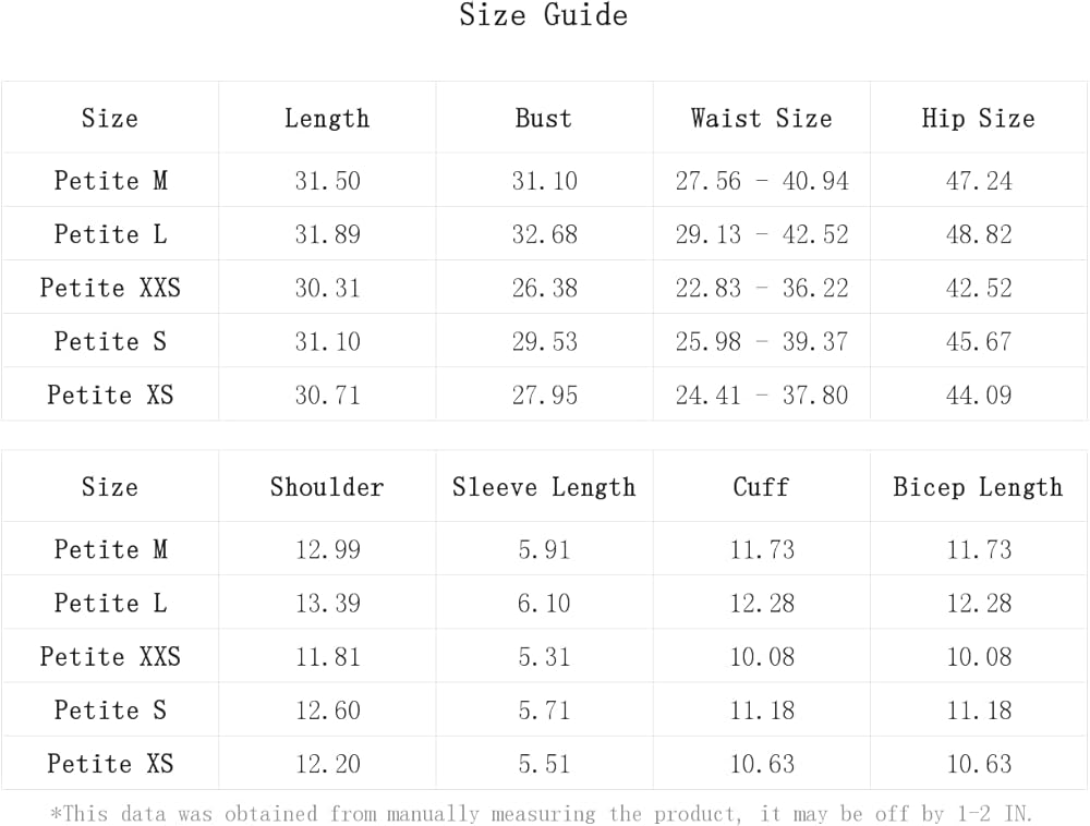 Petite XS:Bicep Length:10.6IN,Bust:28.0IN,Cuff:10.6IN,Hip Size:44.1IN,Length:30.7IN,Shoulder:12.2IN,Sleeve Length:5.5IN,Waist Size:24.4-37.8IN