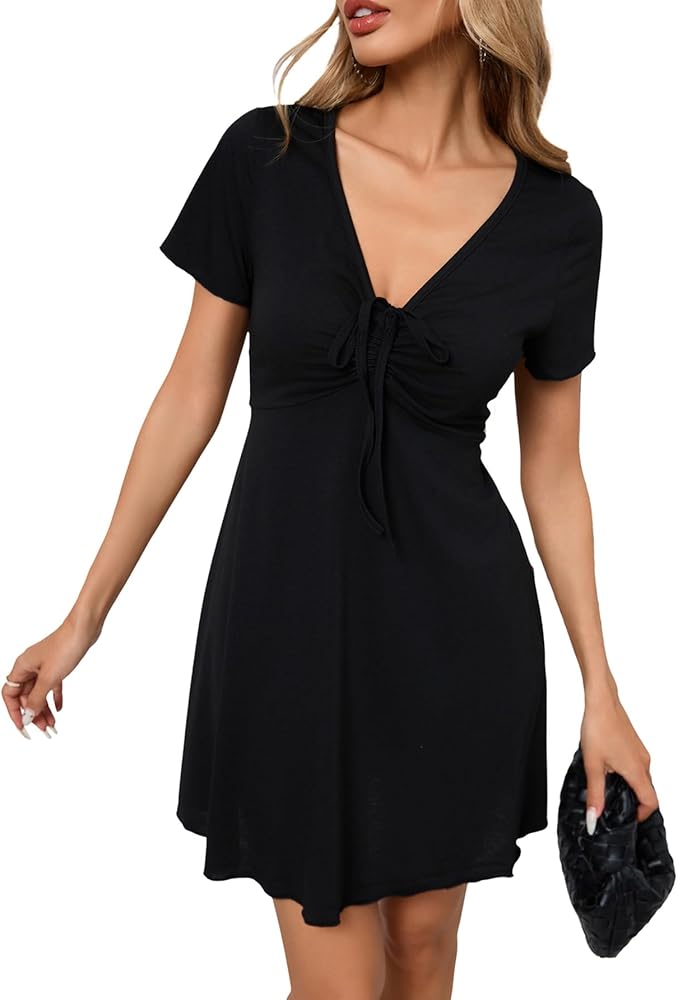 • Feature: Drawstring, Knot Front, Ruched, V Neck, Short Sleeve, Lettuce Trim, Above Knee Length, Plain, Casual Short Swing Dress for Women