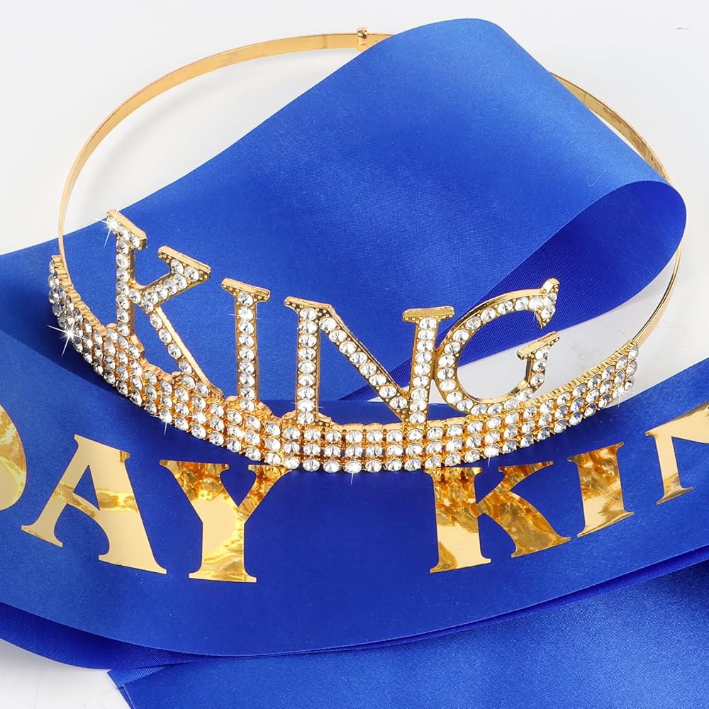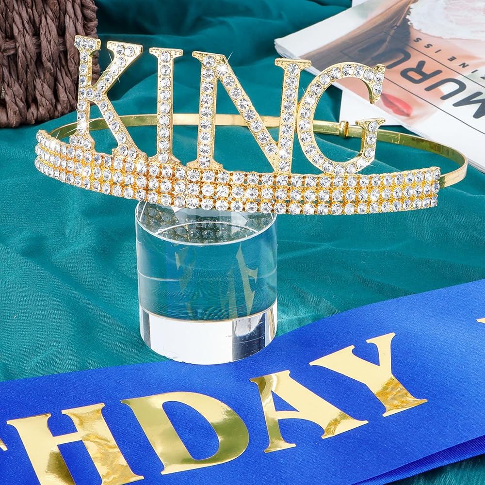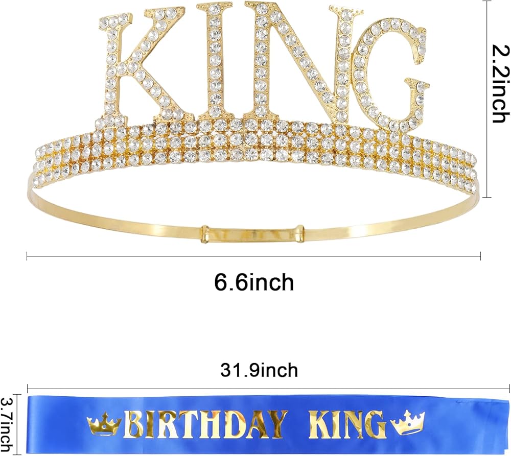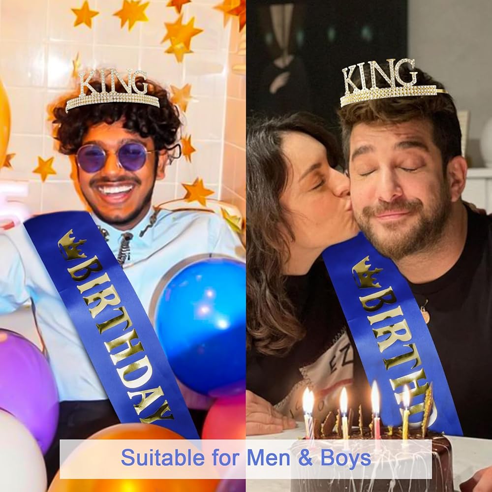 🤴🏻【Material】This special king tiara is made of sturdy metal and hand-set with vibrant silver or gold coloured diamonds. The metal gives it a sturdy and long-lasting feel, while the coloured diamonds add a touch of excitement and glamour. The birthday sash is made from the most beautiful glittery material and hand pressed aluminium foil that reads "BIRTHDAY KING".