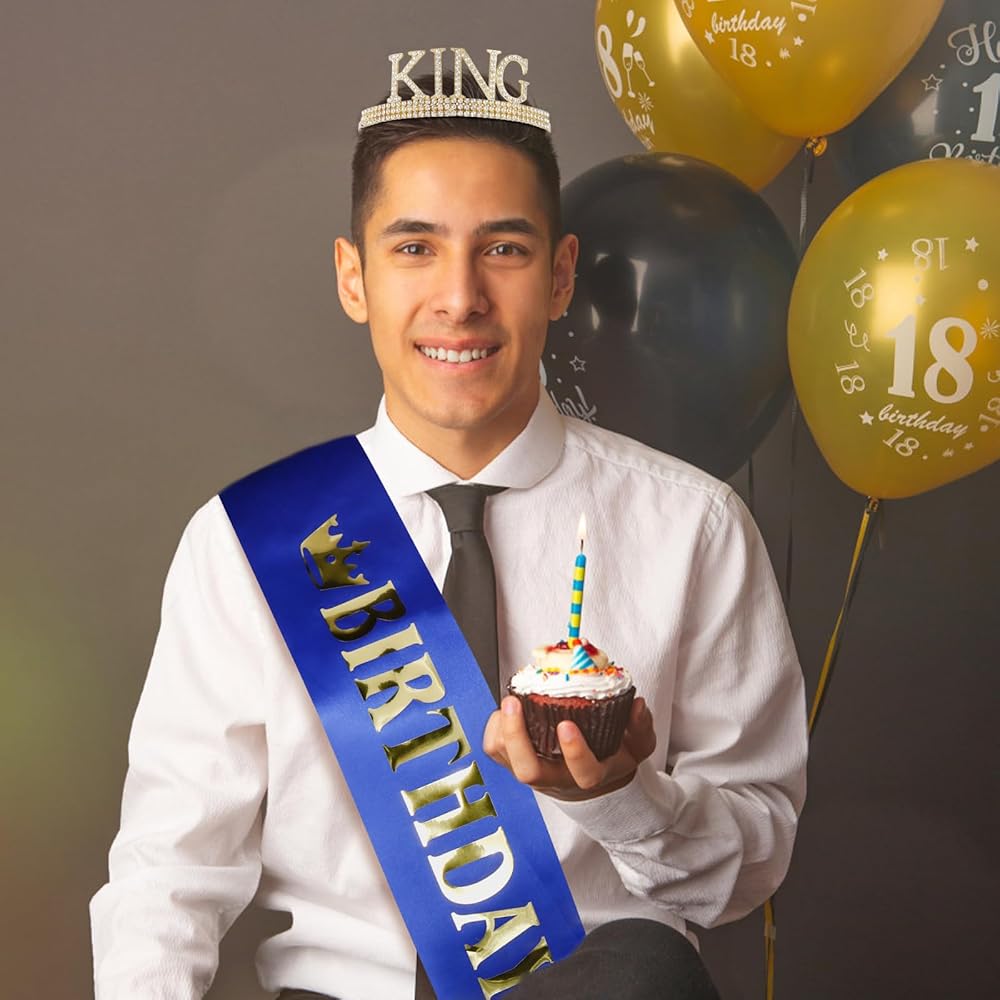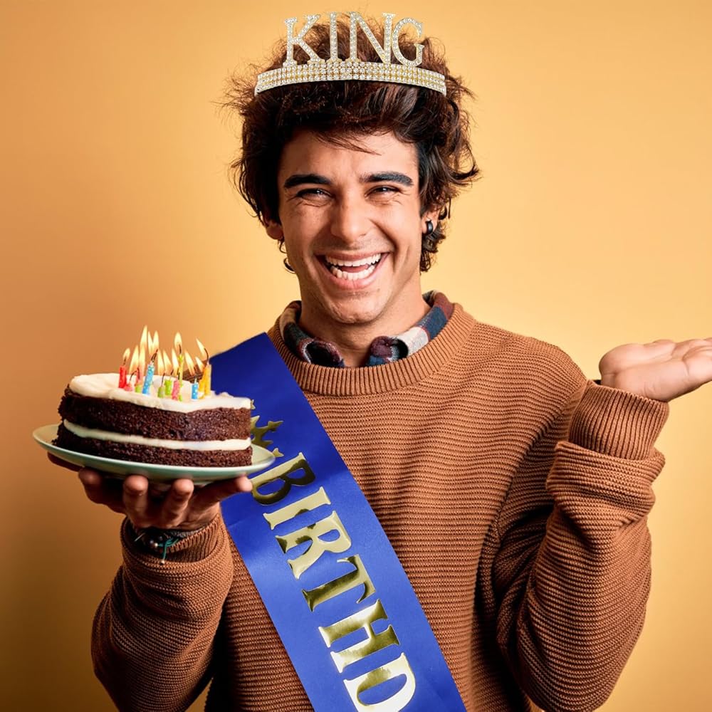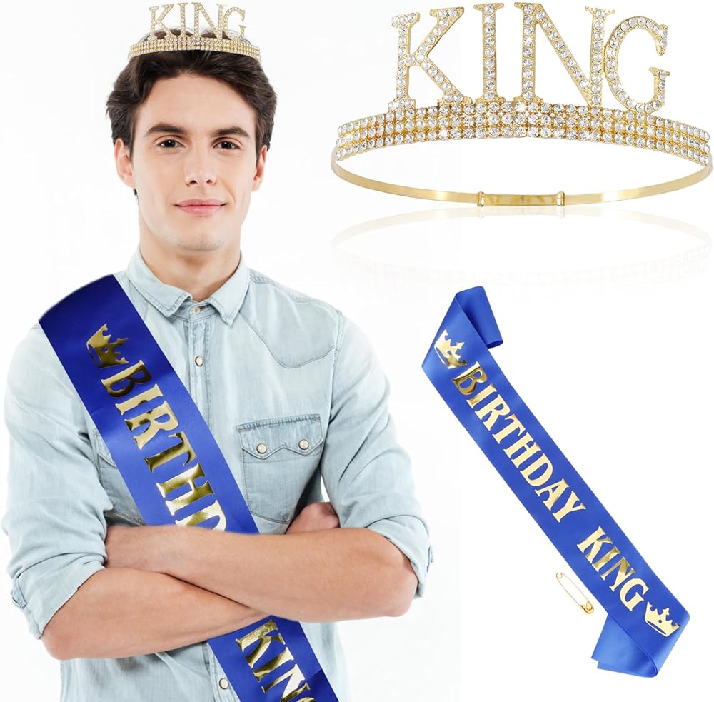 🤴🏻【Material】This special king tiara is made of sturdy metal and hand-set with vibrant silver or gold coloured diamonds. The metal gives it a sturdy and long-lasting feel, while the coloured diamonds add a touch of excitement and glamour. The birthday sash is made from the most beautiful glittery material and hand pressed aluminium foil that reads "BIRTHDAY KING".