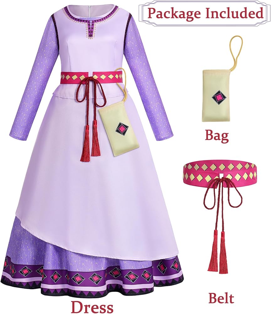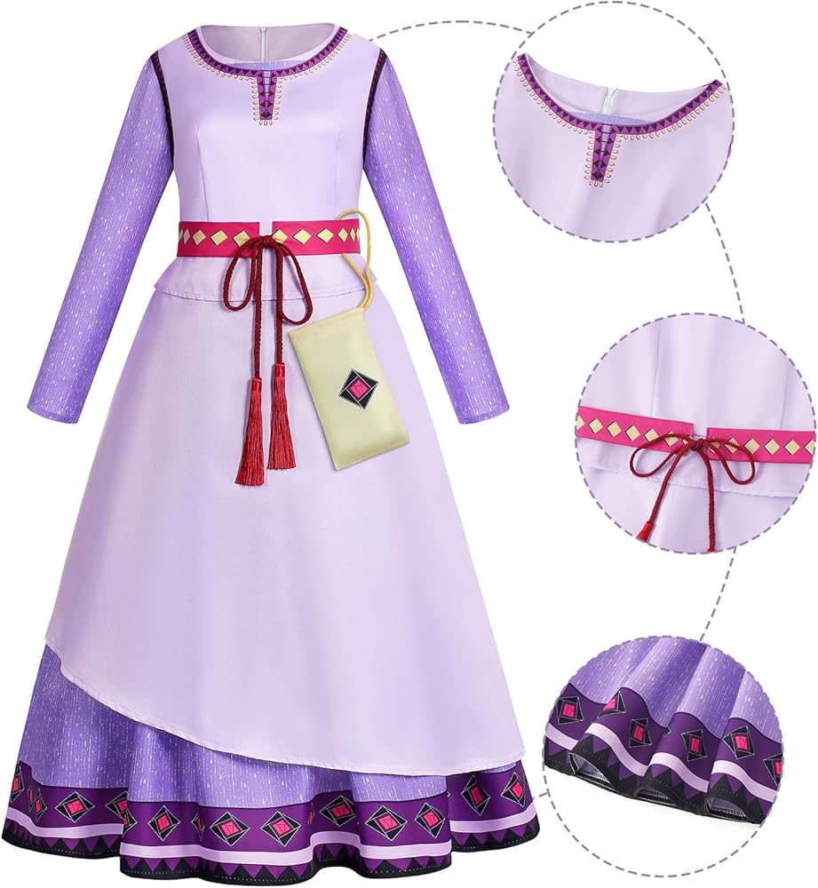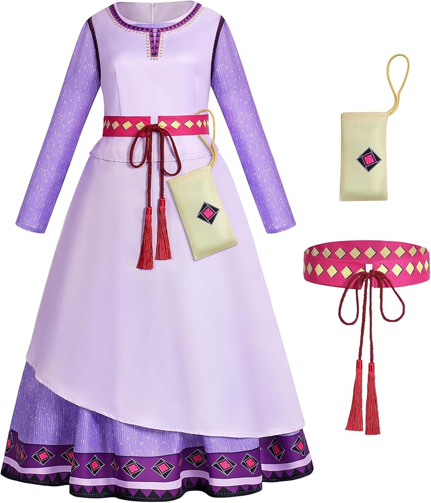 مجموعة الأميرة الكاملة: تحول إلى الأميرة آشا مع فستاننا الأرجواني طويل الأكمام والخصر وحقيبة الخصر القابلة للإزالة - كل التفاصيل للحصول على مظهر سحري وآسر.