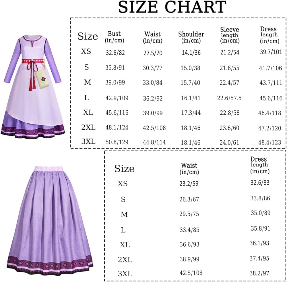 دليل المقاسات الدقيق: تأكد من الملاءمة المثالية من خلال الرجوع إلى جدول المقاسات الخاص بنا، مما يضمن الراحة وتجربة زي الأميرة آشا الأصلية لك.