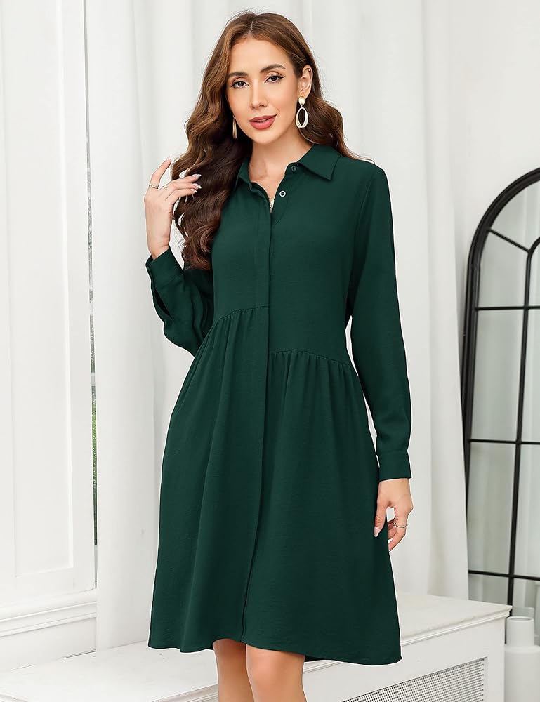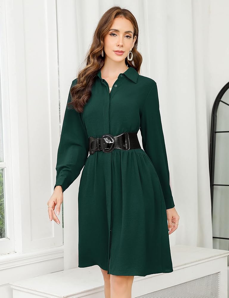 المزايا: فستان نسائي كاجوال للربيع/الصيف/الخريف/الشتاء، فستان متوسط الطول برقبة على شكل حرف V وأكمام طويلة، فستان قميص بأزرار سفلية مع حزام، فستان متوسط الطول بأزرار أمامية. فستان القميص الكلاسيكي والأزرار عبارة عن أزرار مخفية وظيفية (كما هو موضح في الفيديو)، وليست شفافة على الإطلاق.