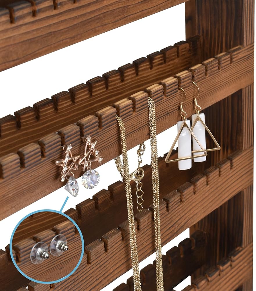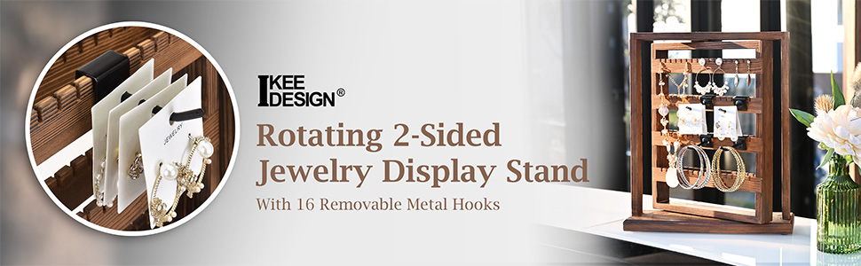 WOODEN JEWELRY DISPLAY RACK WITH HOOKS - Comes with 16 removable metal hooks for earring ,earring cards, bracelets, necklaces, rings, hair accessories or keychains. Hook length : 1.35" long ;accommodate approximately 4 pairs of earring cards , or 4 strands of bracelets.