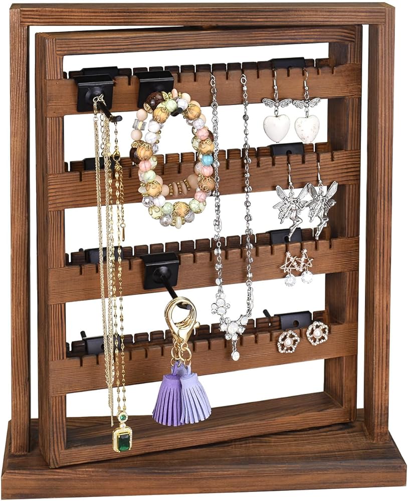 2 SIDED JEWELRY DISPLAY STAND FOR VENDORS- 2 sided jewelry display rack .4 layers of display bars that each bar has 17 grooves with 136 grooves in total hold up to 64 pairs of earrings. Hooks are removable and easy to hang on the display bars for extra display arrangement.