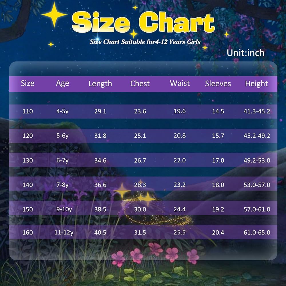 🧍🏽♀️ يحتوي زي Wish Asha على 6 مقاسات للفتيات، العمر هو القيمة الموصى بها فقط، يرجى قياس حجم جسم الطفل والرجوع إلى جدول المقاسات لاختيار المقاس المثالي.