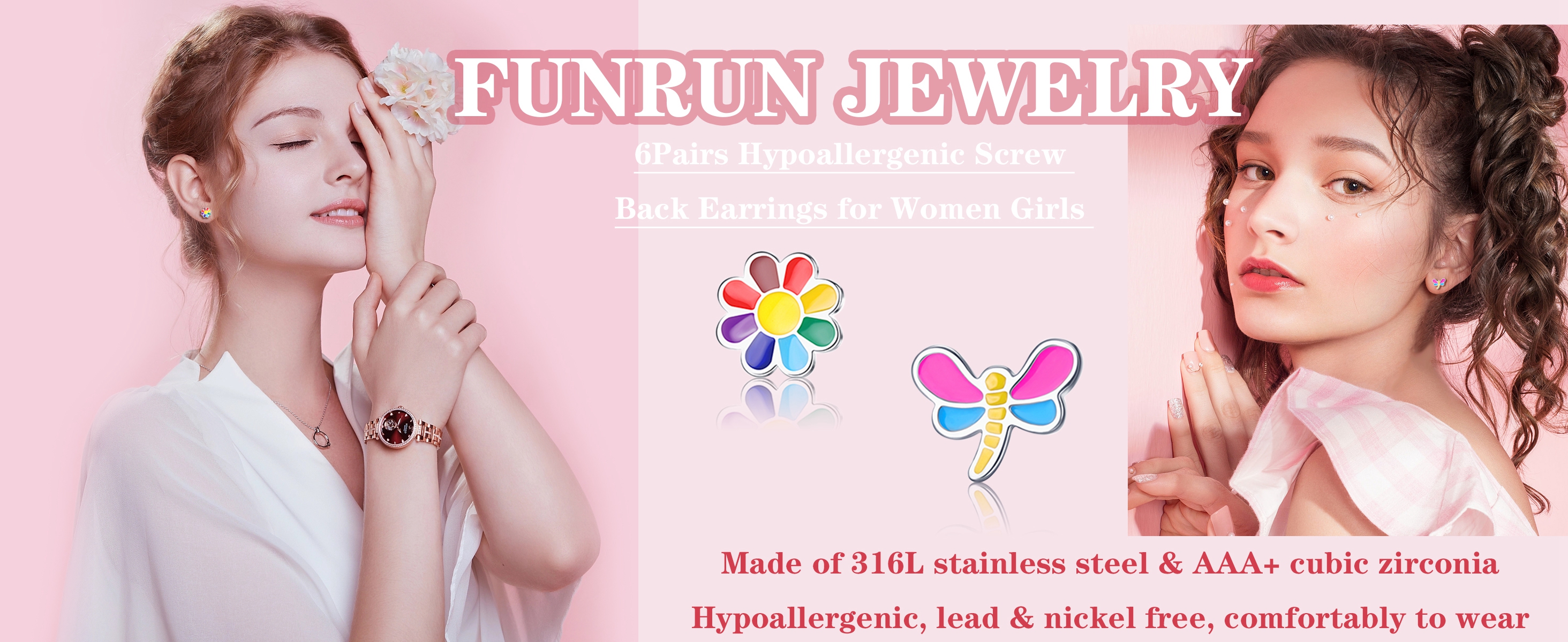 FUNRUN JEWELRY 6 أزواج من الأقراط المسمارية المضادة للحساسية للنساء 316L من الفولاذ المقاوم للصدأ على شكل قلب قوس قزح وزهرة فراشة متعددة الألوان على أقراط مسمارية