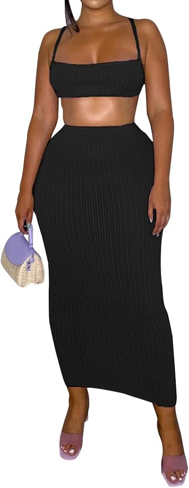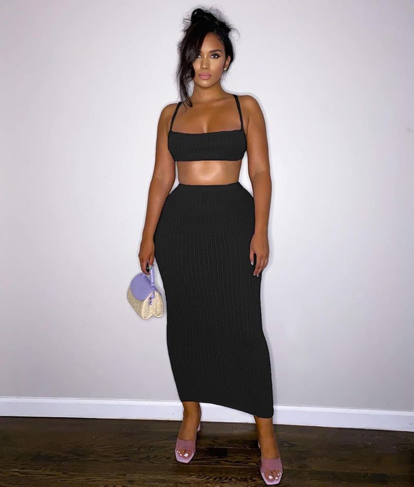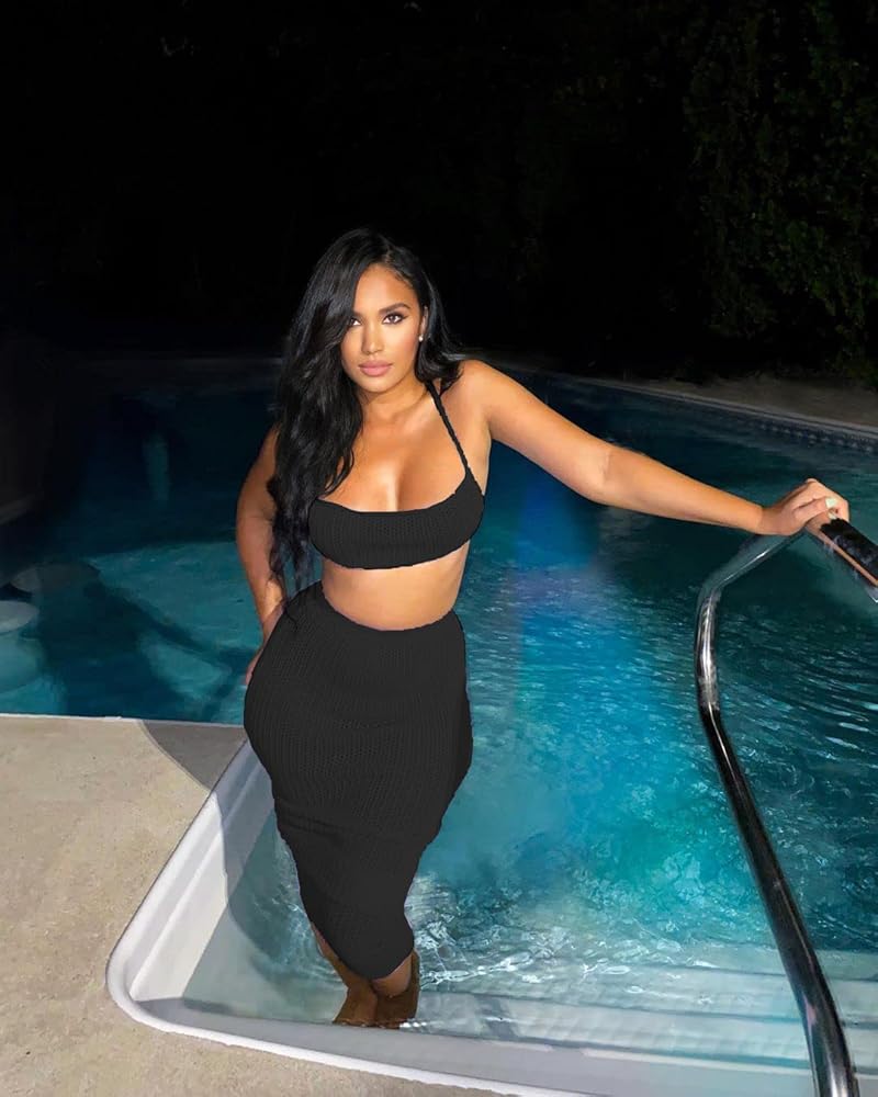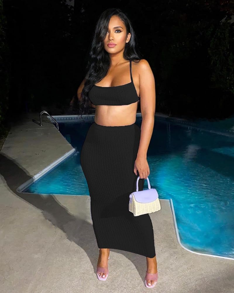 Top: Sleeveless,criss cross,tie backless,sexy halter crop top for women.Skirt: High elastic waist,long skirt,2 pieces skirt outfits.