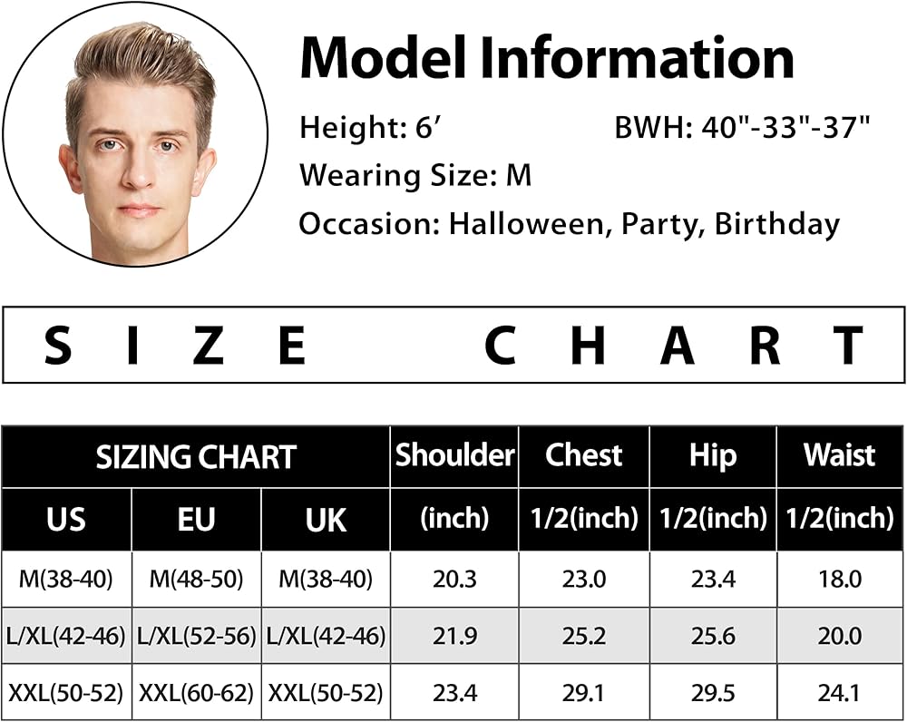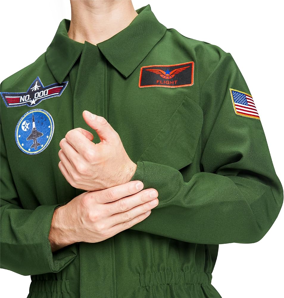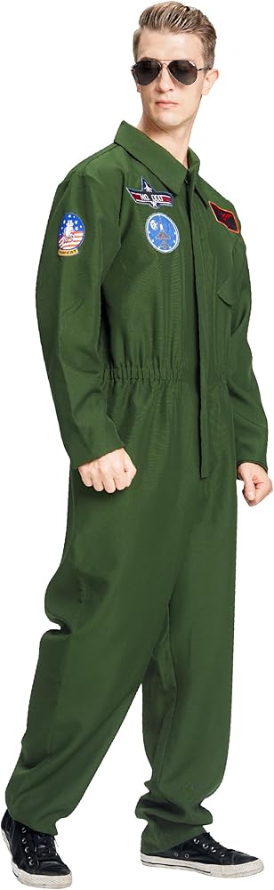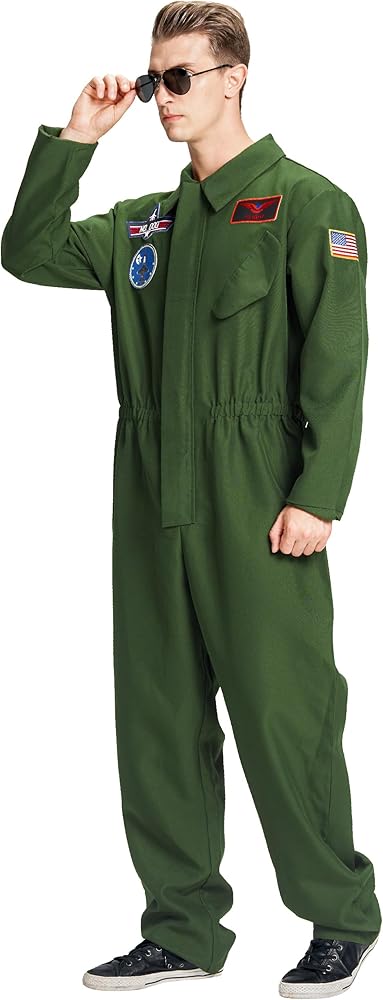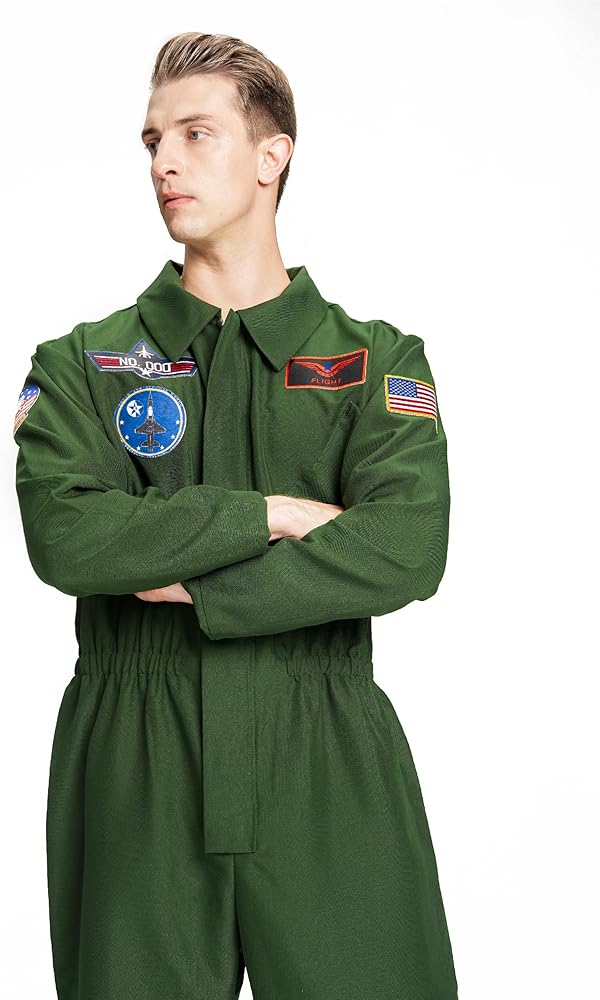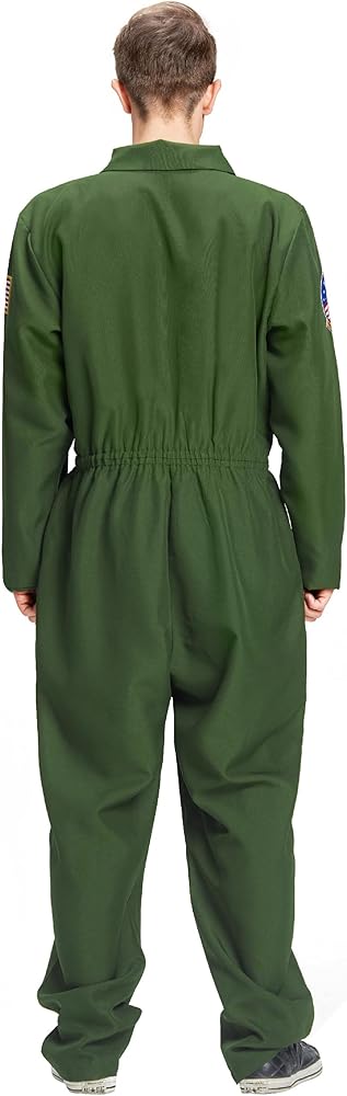 • زي الطيار الرجالي ذو اللون الأخضر الداكن يحتوي على عدة رقع مطرزة من الفيلم، العلم الأمريكي على الكتف الأيسر. جيب كاذب على الصدر. حزام خصر مطاطي على الجزء الأمامي والخلفي من البدلة. ارتدي ملابسك وحلق عالياً في عيد الهالوين لاستكشاف المزيد من المغامرات!