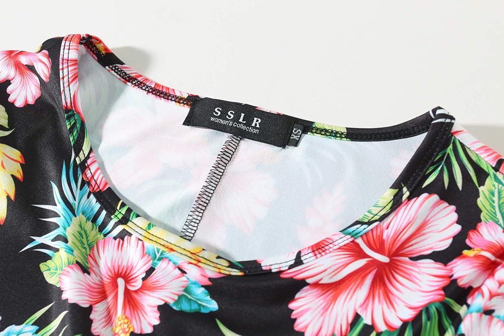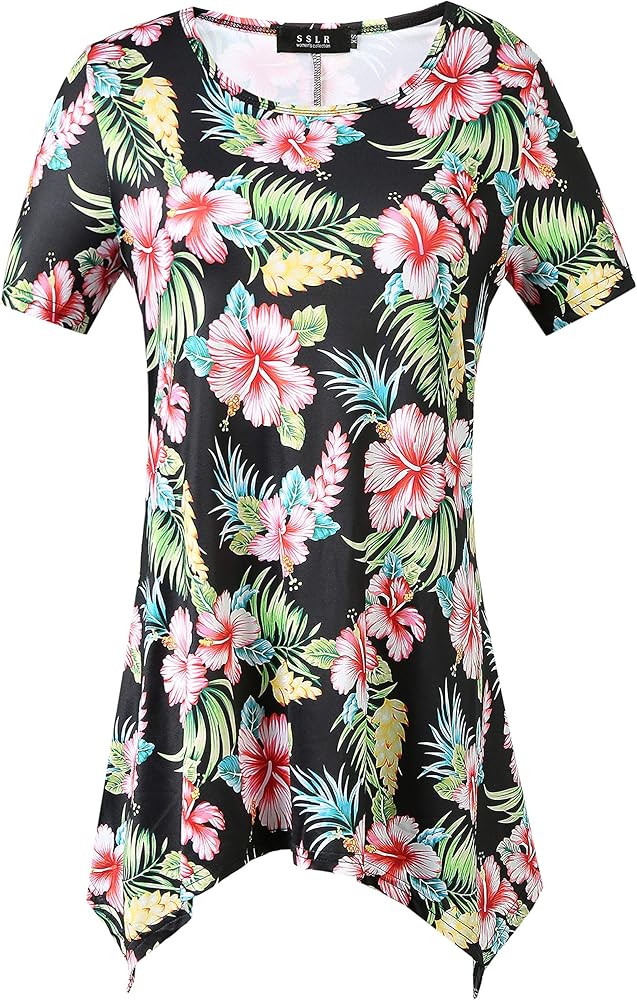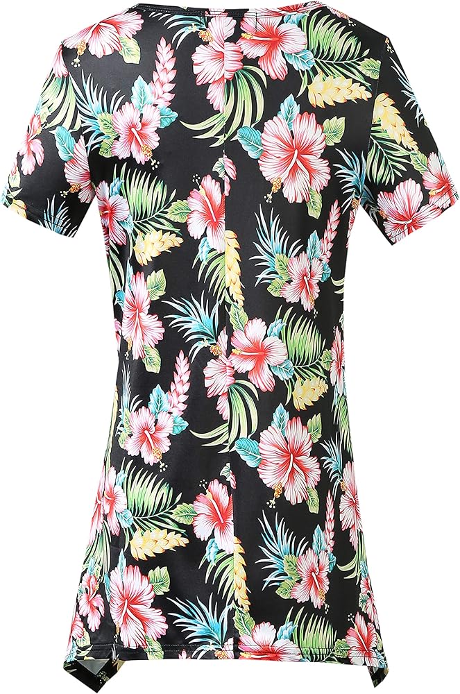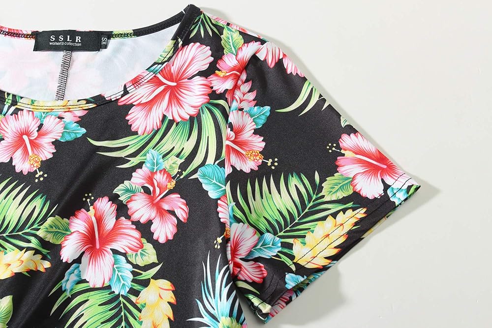 تصميم أنيق: تي شيرت برقبة دائرية، وأكمام قصيرة، وحاشية فريدة، وطبعات زهور نابضة بالحياة