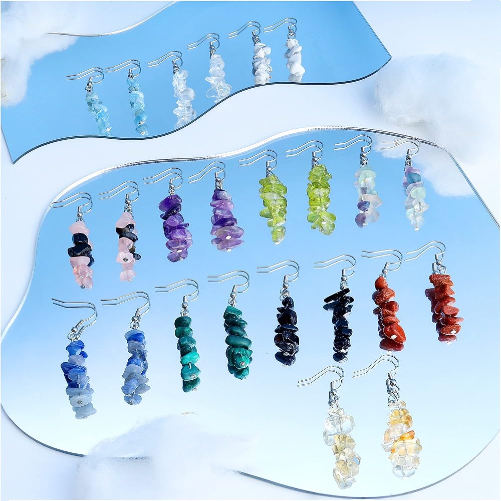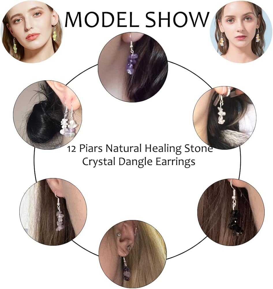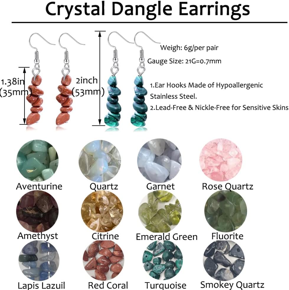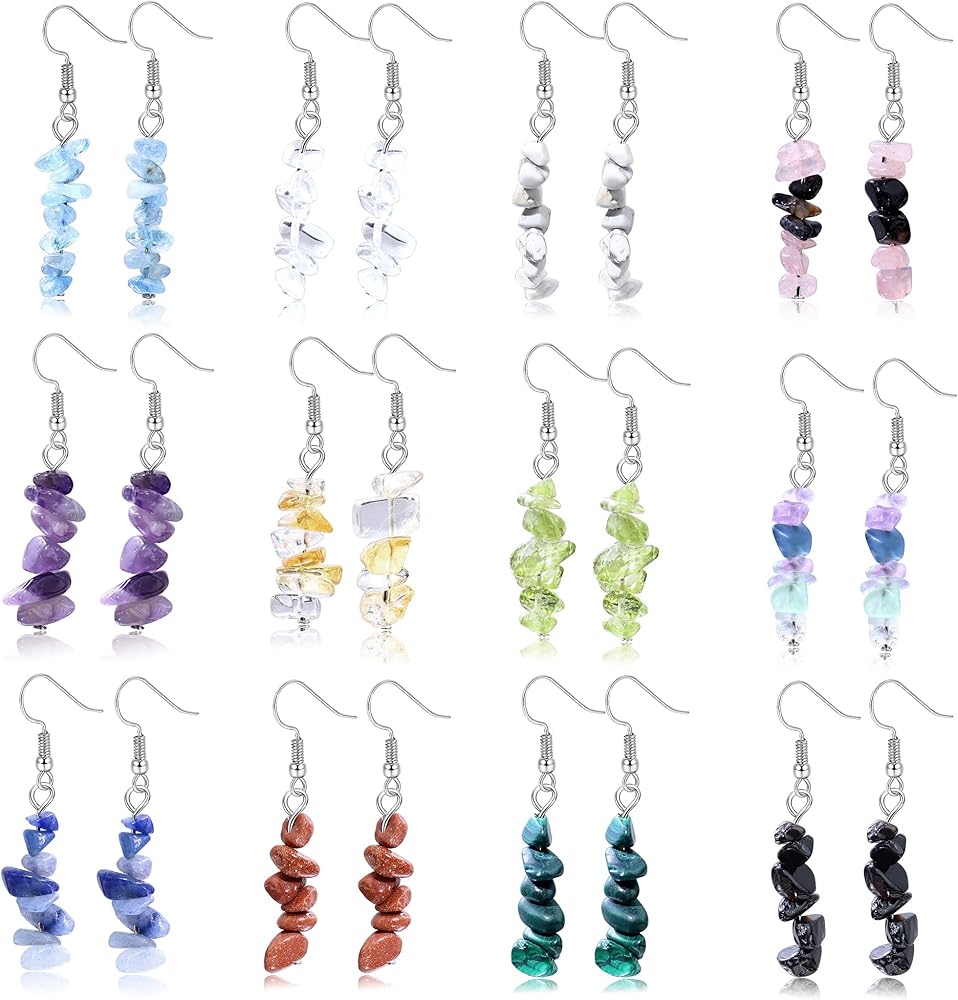 ❤المميزات: مجموعة من 12 زوجًا من الأقراط الكريستالية، كل حجر طبيعي له لون محدد، مما يمنحك تشجيعًا روحيًا عند ارتدائه. فهو يطلق طاقة إيجابية لتنقية هالتك، مما يتيح لك الشعور بالسلام الداخلي