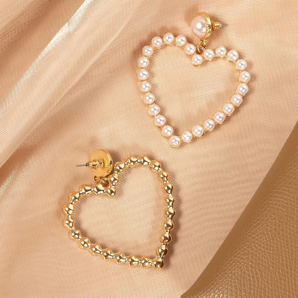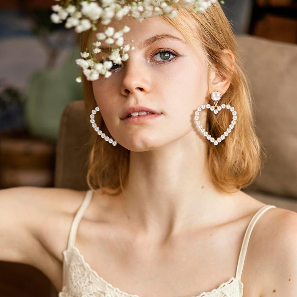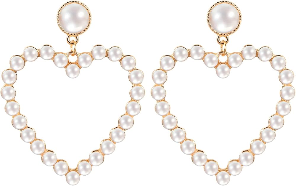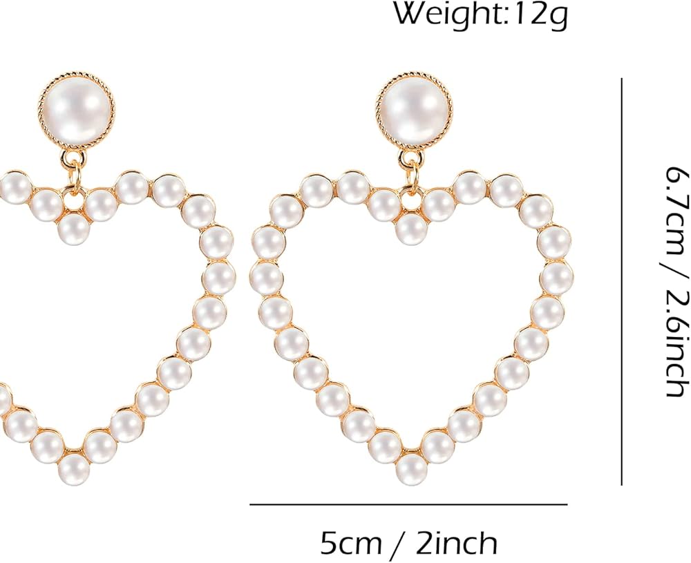 Pearl Heart Earrings Stud Dangling Women Girls Christmas Valentines Love Dangle Drop Earring Gold Fashion Statement Jewelry Bridal Wedding Prom Birthday Party Mother's Day Favor Gift, 2.36x1.96inch,
