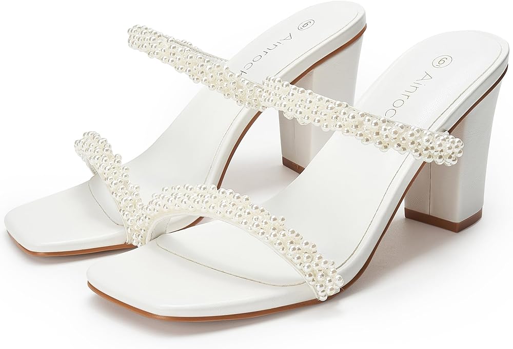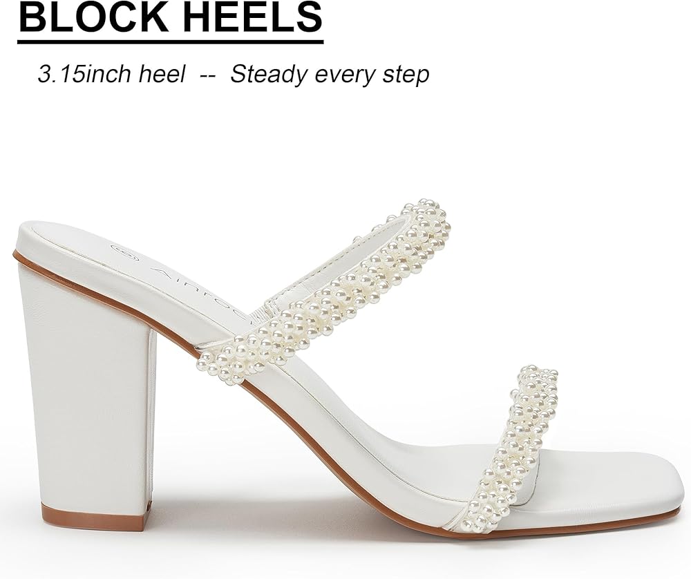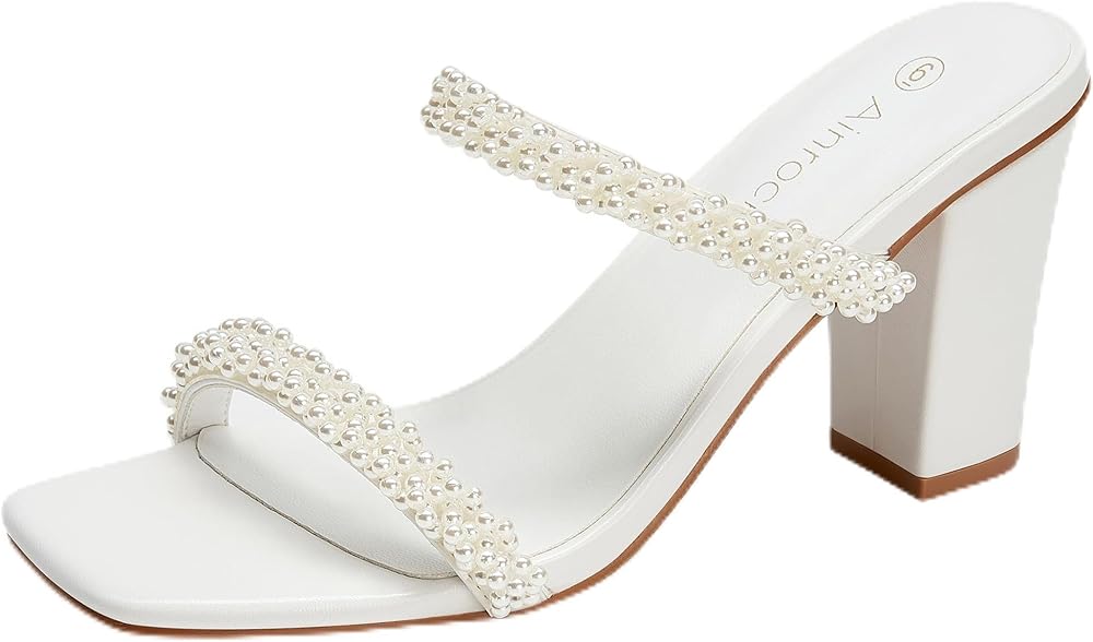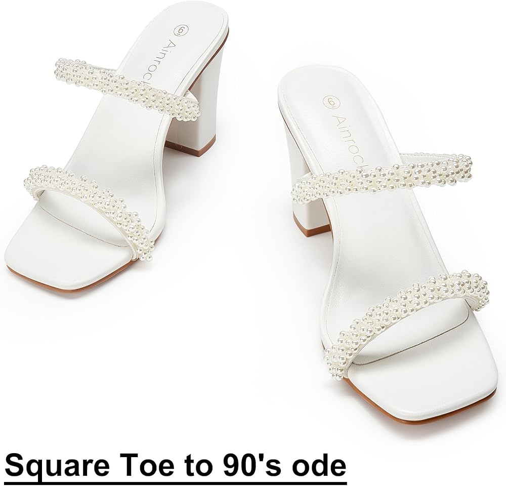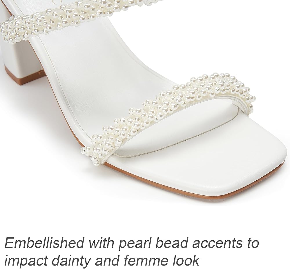 صنادل نسائية بكعب لؤلؤي وكعب مكتنز وإصبع مربع وشريطين سهل الارتداء بكعب 3.1 بوصة لفستان الزفاف