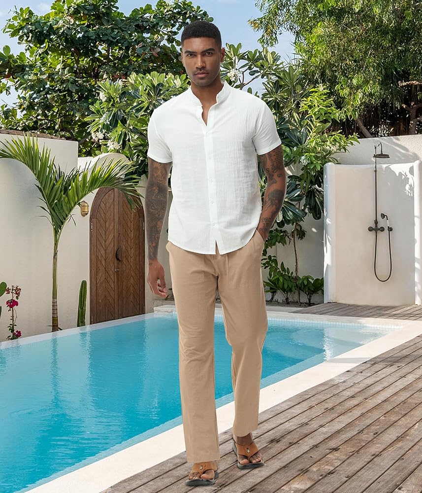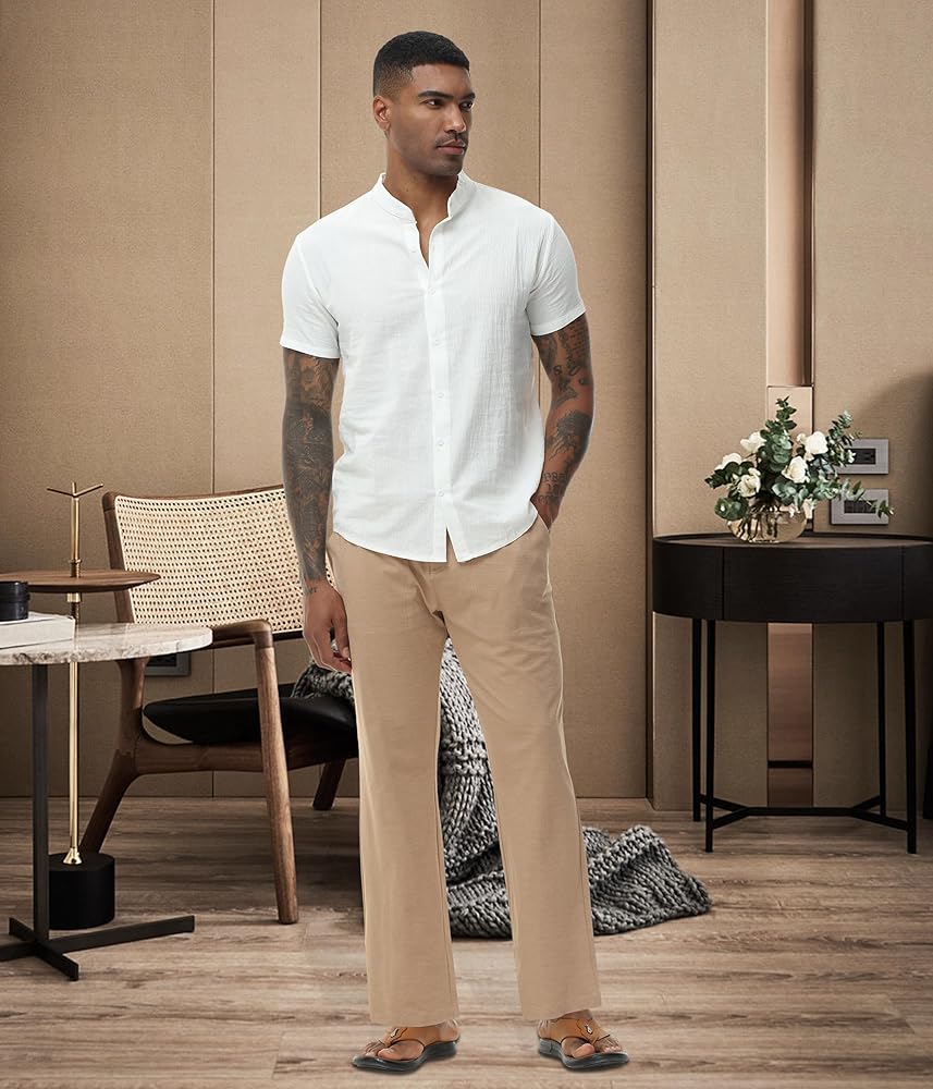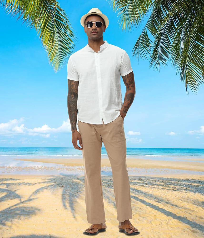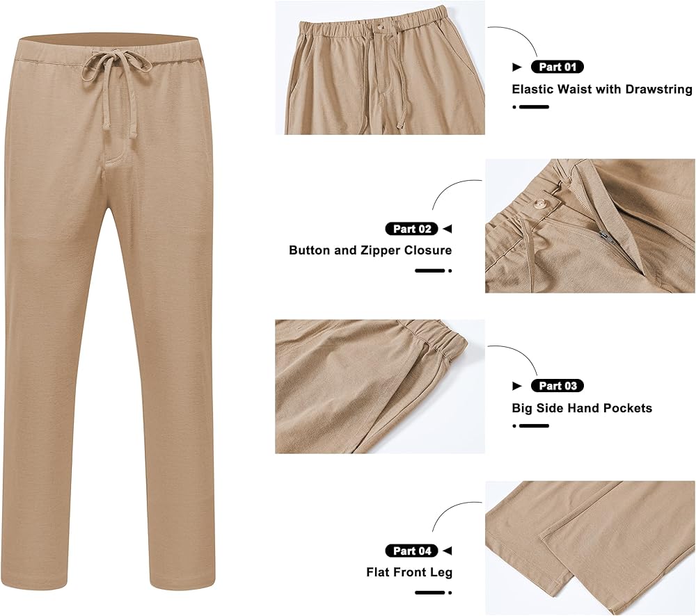 مطابقة: تصميم بسيط، تبدو السراويل الكتانية الرجالية رائعة لتتماشى مع القمصان الكاجوال الفضفاضة أو تي شيرت، وسترة، وقمصان هاواي، والصندل، والأحذية الرياضية، والأحذية القماشية وما إلى ذلك.