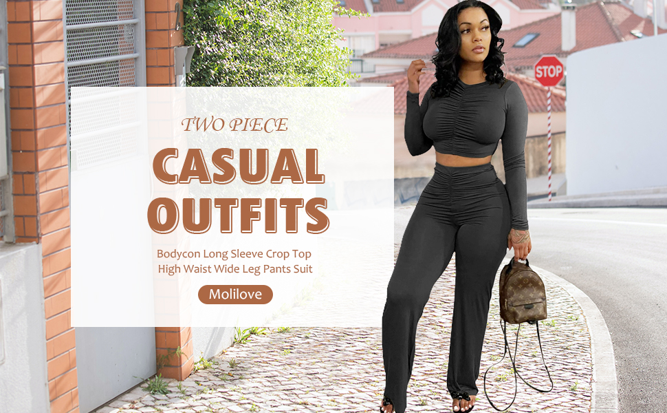 Molilove قطعتين ملابس للنساء مثير Bodycon كم طويل المحاصيل الأعلى عالية الخصر واسعة الساق السراويل دعوى 2 قطعة مجموعة