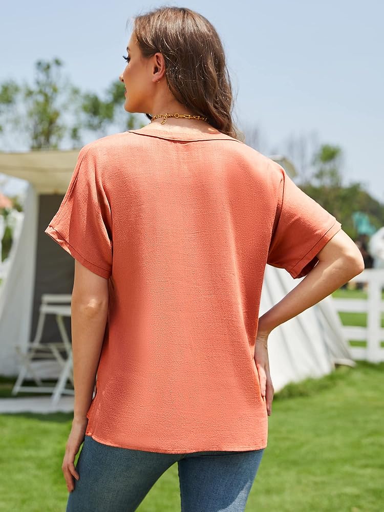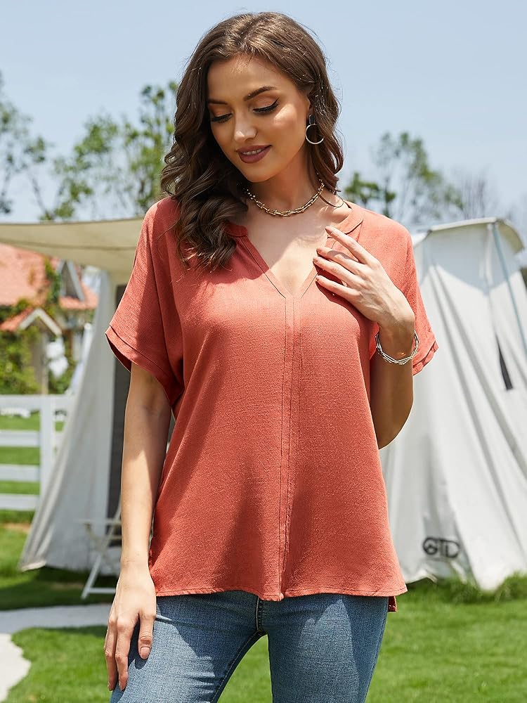 【المميزات】: قمصان الكتان الكاجوال للسيدات لن يمكن رؤيتها من خلالها. الرقبة على شكل حرف V كلاسيكية وأنيقة، مما يبرز رقبتك الأنيقة. الحافة الأنيقة للأكمام القصيرة لطيفة وتخفي دهون الذراع، ومن المؤكد أنها ستجذب تلك النظرات الحسودة.