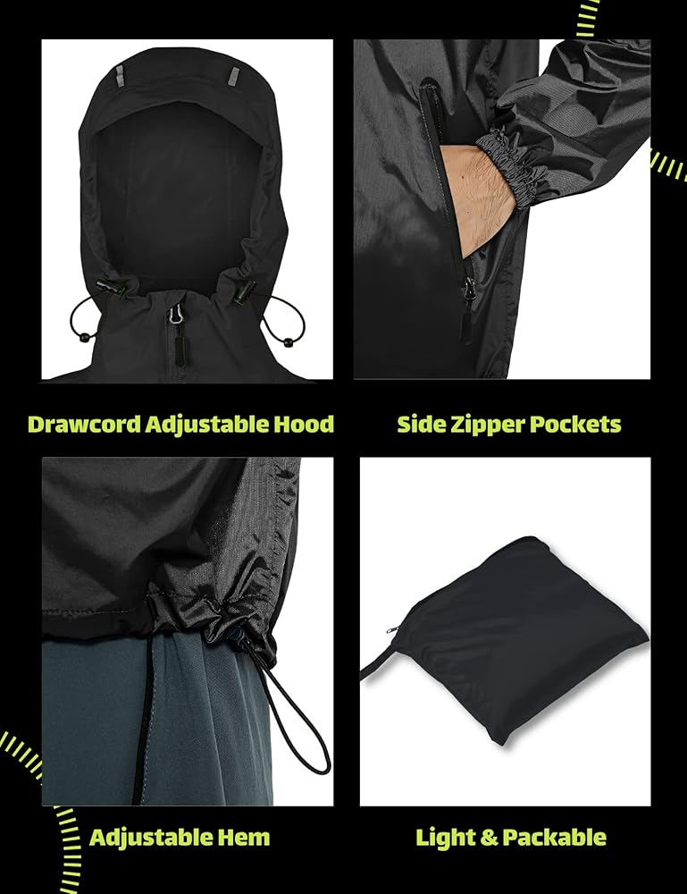 【تحرك في الرذاذ】مقاس فضفاض لإحساس واسع وواسع. معدات المطر الخفيفة المثالية للجري وركوب الدراجات والماراثون وكرة القدم والجولف وصيد الأسماك والتخييم والمشي لمسافات طويلة وحقائب الظهر والممرات والسفر والأنشطة الخارجية الأخرى في جميع المواسم. نحن نعرض سترة المطر القابلة للطي حتى مقاس 3XL/4XL باللون الأسود/الأزرق الداكن/الرمادي/الأصفر النيون/البرتقالي النيون، مما يسمح لك بالشعور بأفضل ما لديك في جميع الأوقات.