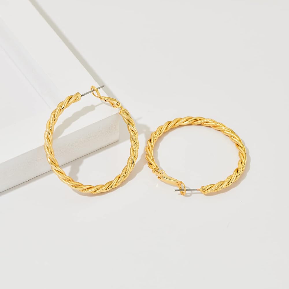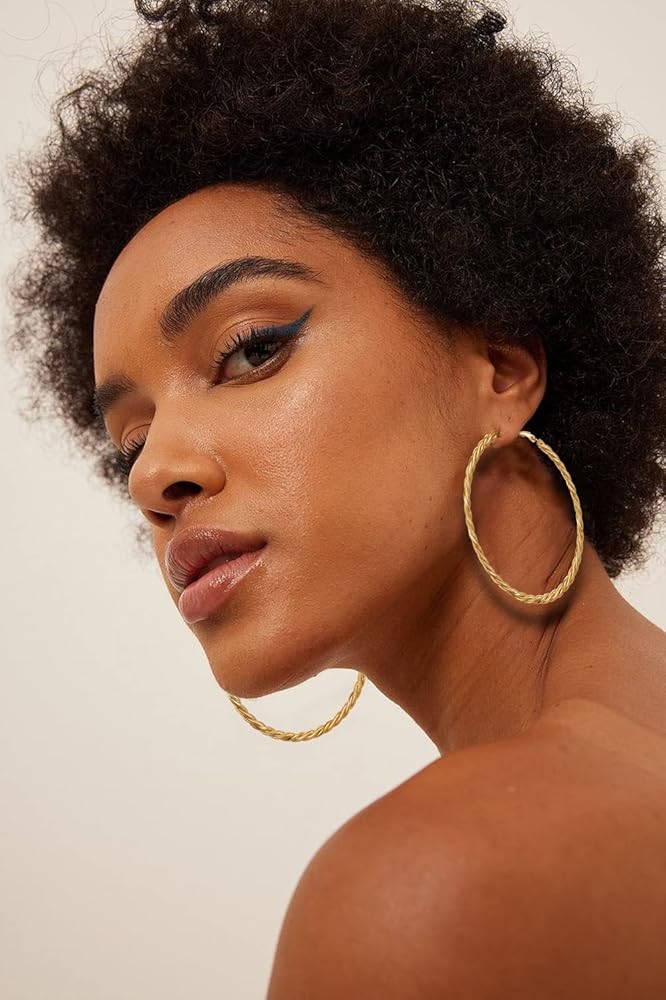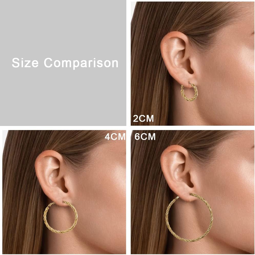 مقاس الأقراط الذهبية: القطر: 2 1/4 بوصة (60 مم). هذا القرط الذهبي مصنوع بإبرة من الفولاذ المقاوم للصدأ لمنع الحساسية. أقراطنا الحلقية الملتوية ليست ثقيلة (حلق واحد 0.28 أونصة)، مصقولة يدويًا، ومصنوعة بتقنية النقر الآمنة لضمان راحة الارتداء.