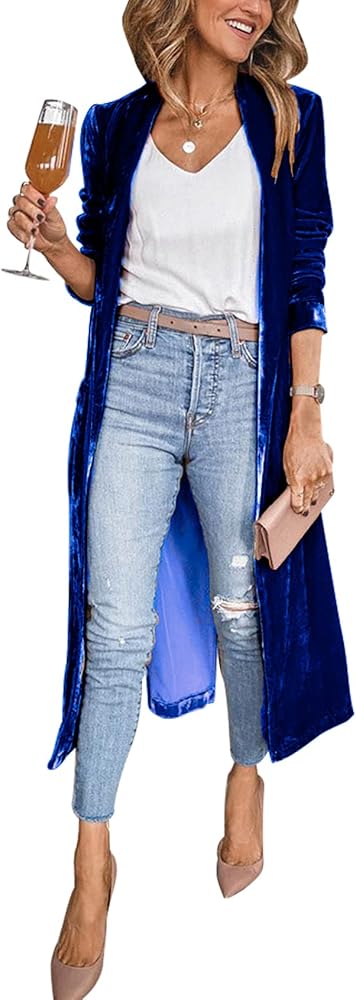 بليزر كاجوال مخملي للنساء مصمم بنمط مفتوح من الأمام وأكمام طويلة وطول ماكسي