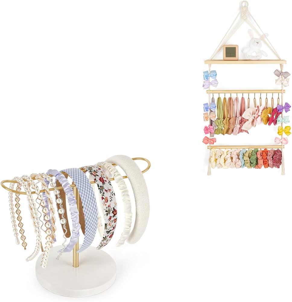 سعة كبيرة: حامل قوس للفتيات بتصميم فيونكات شعر مع صفين من شماعات تخزين عصابات الرأس مع 24 خطافًا (يمكن تعليق كل خطاف بعصابتي رأس)، ويمكن استيعاب ما يصل إلى 48 عصابة رأس. تعتبر الحبال القطنية الموجودة على الجانبين والجزء العلوي مثالية لقص مشبك شعر القوس للفتيات (الأقواس وعصابة الرأس غير متضمنة). يتيح لك التصميم الفريد الحصول على رف إضافي للعناصر الزخرفية أو العناصر الصغيرة.