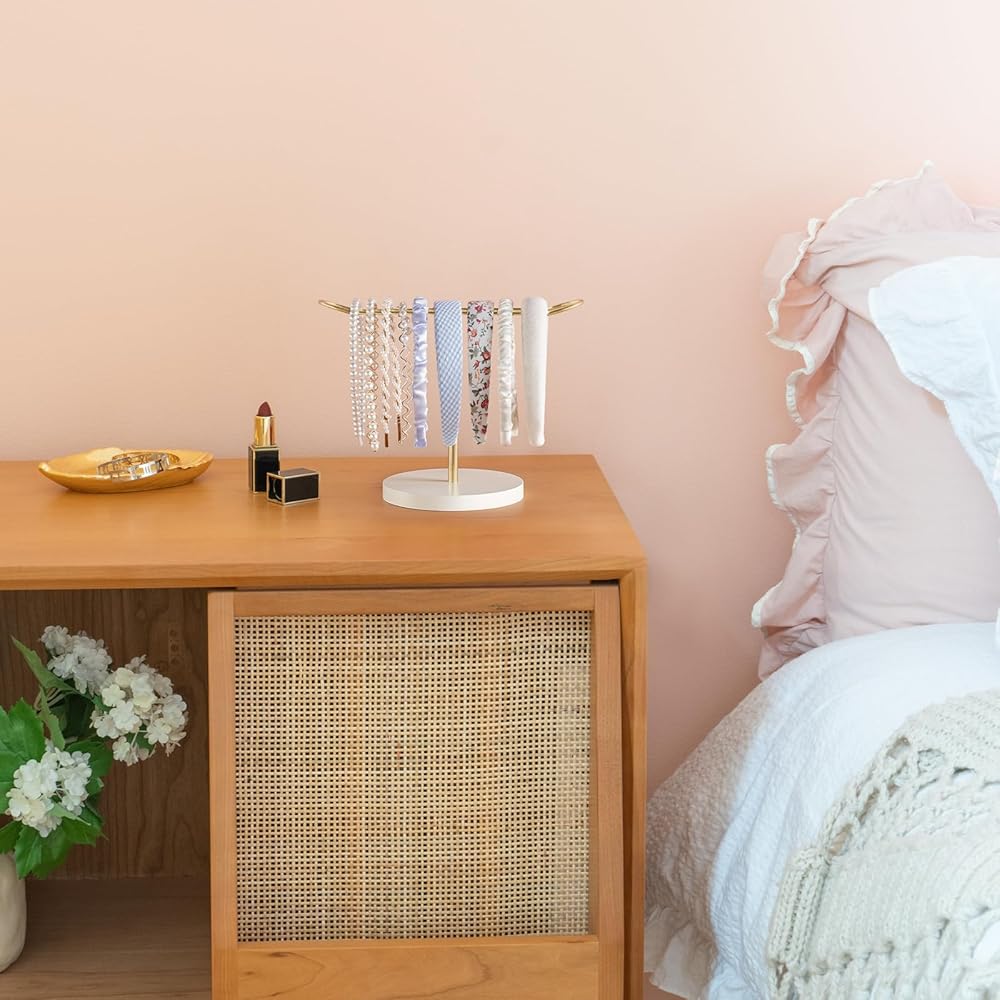 تصميم خاص: تنحني نهاية قضيب التعليق المعدني لأعلى لمنع سقوط أربطة الشعر وأطواق الشعر؛ تضمن الصنعة الدقيقة الأسطح والحواف الناعمة التي لن تلحق الضرر بإكسسوارات شعرك.