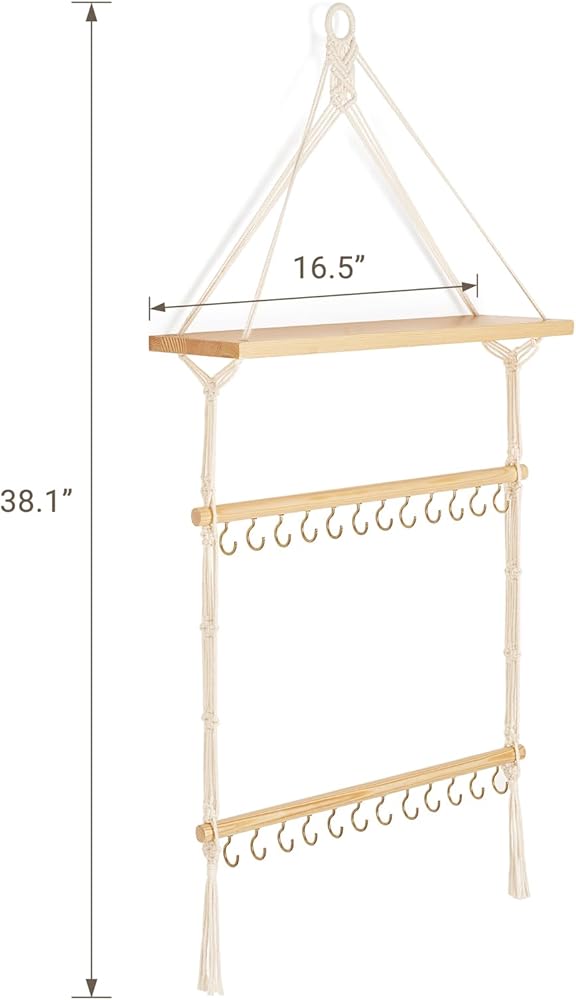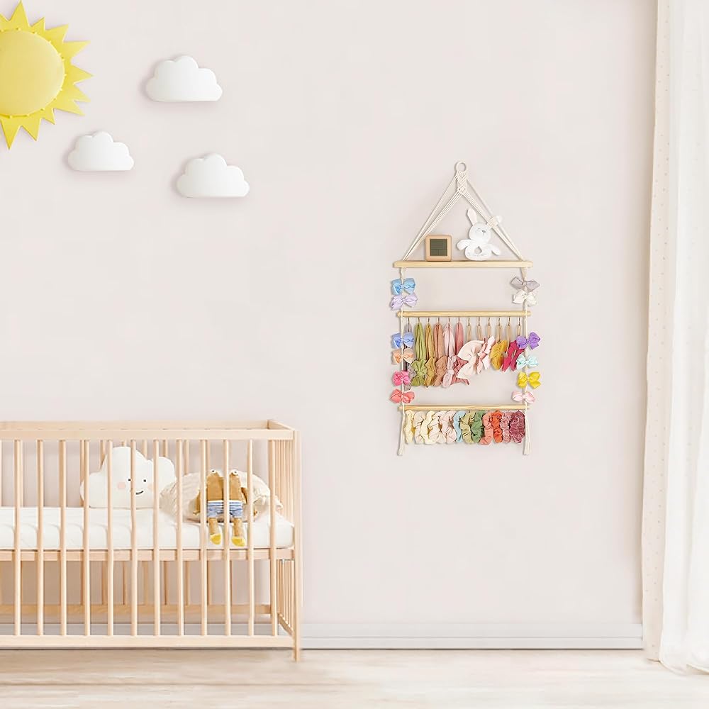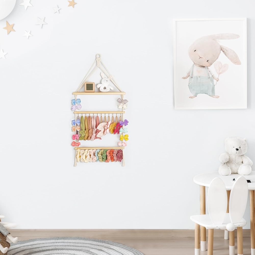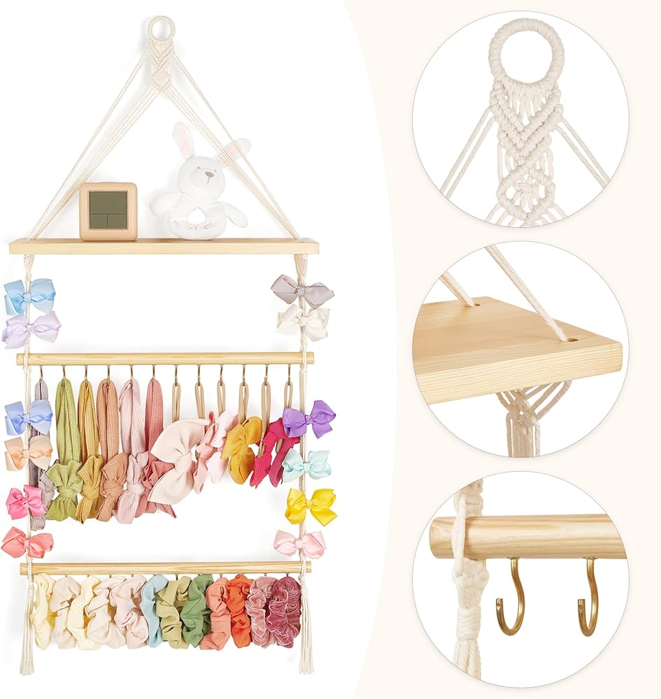 المواد: رف تخزين أقواس الشعر للفتيات هذا مصنوع من خشب الصنوبر وحبل قطني، وهو قوي وليس من السهل تشويهه أو تشققه، وأكثر متانة، مع قدرة تحمل جيدة. الخطاف المصنوع من الفولاذ المقاوم للصدأ المرصع على عصا خشبية، ليس من السهل أن يسقط، يمكن أن يساعدك بشكل أفضل في تخزين إكسسوارات الشعر.