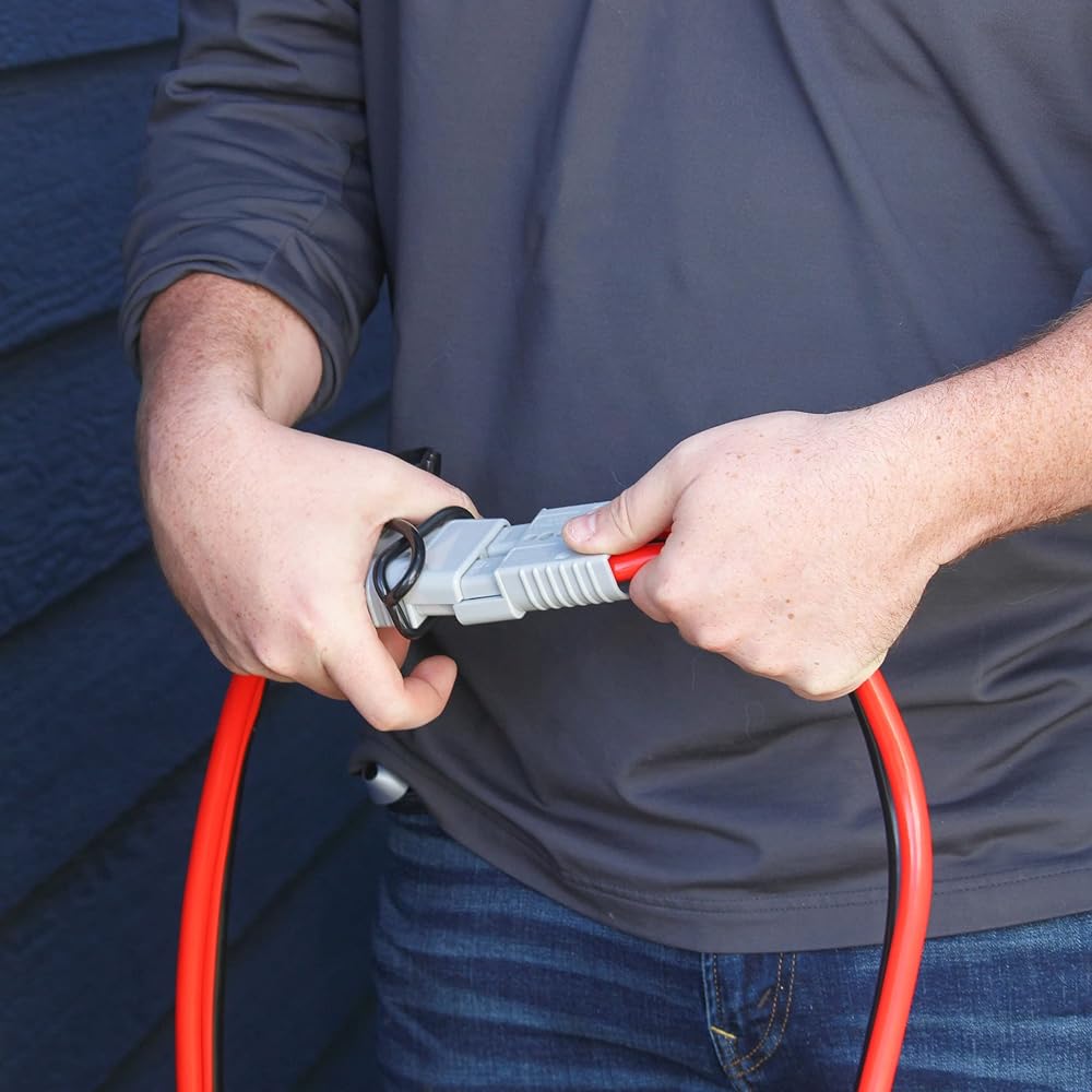 مصمم لأي طقس: خط كابل مزدوج مقاس 1 مصنوع من فكوك نحاسية مسننة على مشابك الببغاء عالية التوتر من أجل الاتصال الأمثل؛ مقابض مطلية بالمسحوق على مشابك معدنية؛ سترة PVC باللونين الأحمر والأسود مقاومة للزيت والمواد الكيميائية والماء والتي تحافظ على الكابلات خالية من التشابك ومرنة في جميع الظروف الجوية حتى عند -40 درجة فهرنهايت (-40 درجة مئوية)