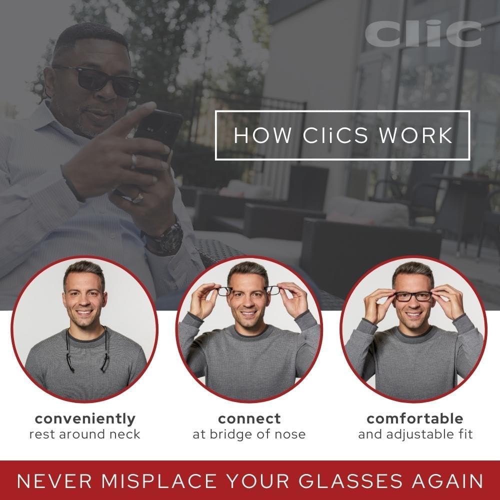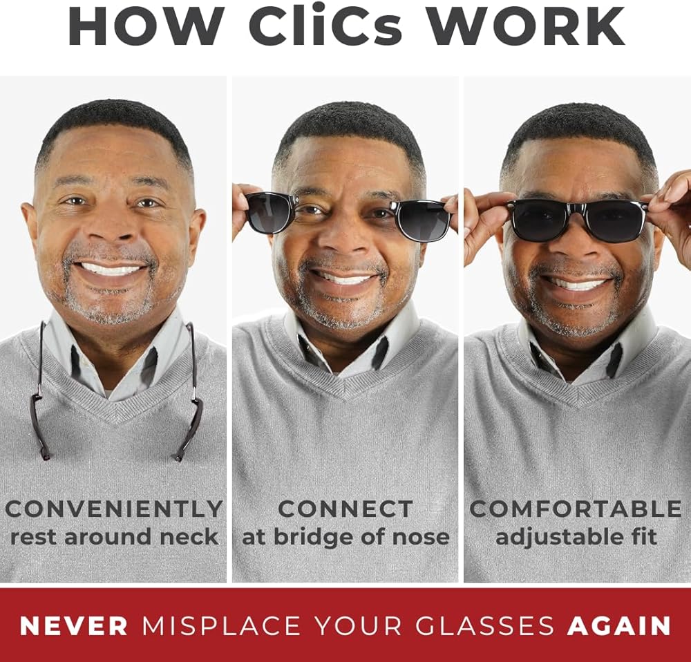 الاستجابة للنظارات في غير موضعها. مع وصلة المغناطيس الأمامية الحصرية من CliC وعصابة الرأس الصلبة الدائمة، فإن ارتداءها وخلعها أمر سريع وسهل. اضبط الأذرع للحصول على ملاءمة مثالية أثناء ارتداء نظارتك أو اجعلها توضع بشكل مريح حول رقبتك عندما لا تكون قيد الاستعمال. لا تفقد نظارتك أبدًا مرة أخرى مع هذه الراحة المدمجة.