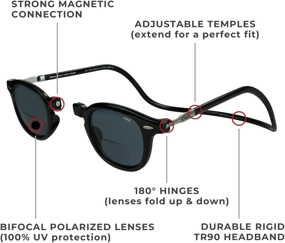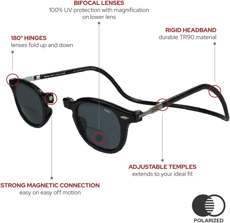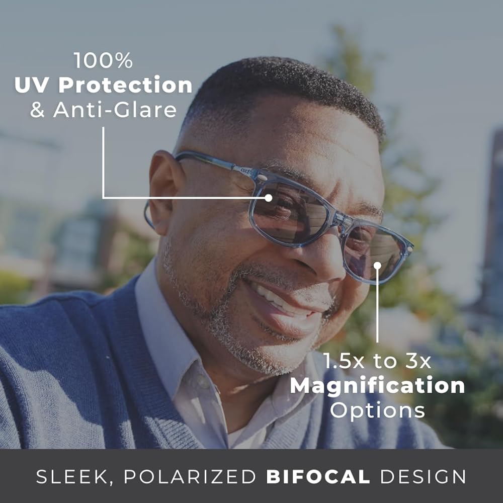 نظارات شمسية عتيقة + عدسة ثنائية البؤرة. تتميز نظارات الشمس الثنائية الكلاسيكية بعدسات شمسية مستقطبة مع تكبير نصف عدسة في الأسفل وحماية 100% من الأشعة فوق البنفسجية الطويلة والمتوسطة في إطار قديم وعصري. عصابة الرأس الملتفة الصلبة مريحة للتعليق حول رقبتك، وتوفر الأذرع القابلة للتعديل نطاقًا صغيرًا إلى متوسط الحجم.
