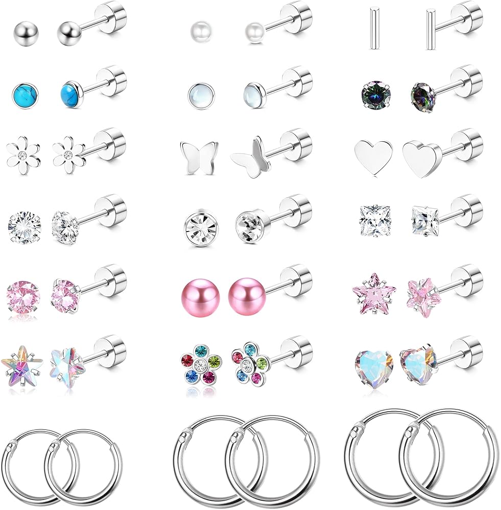 【COMFORTABLE STUD EARRINGS FOR WOMEN】You will get 18 pairs flat back stud earrings and 3pairs hoop earrings with different styles, including star, moon, ball, heart, butterfly, pearl, flowers,and more geometry studs. Small and pretty stud earrings,various of styles can match your different outfits.