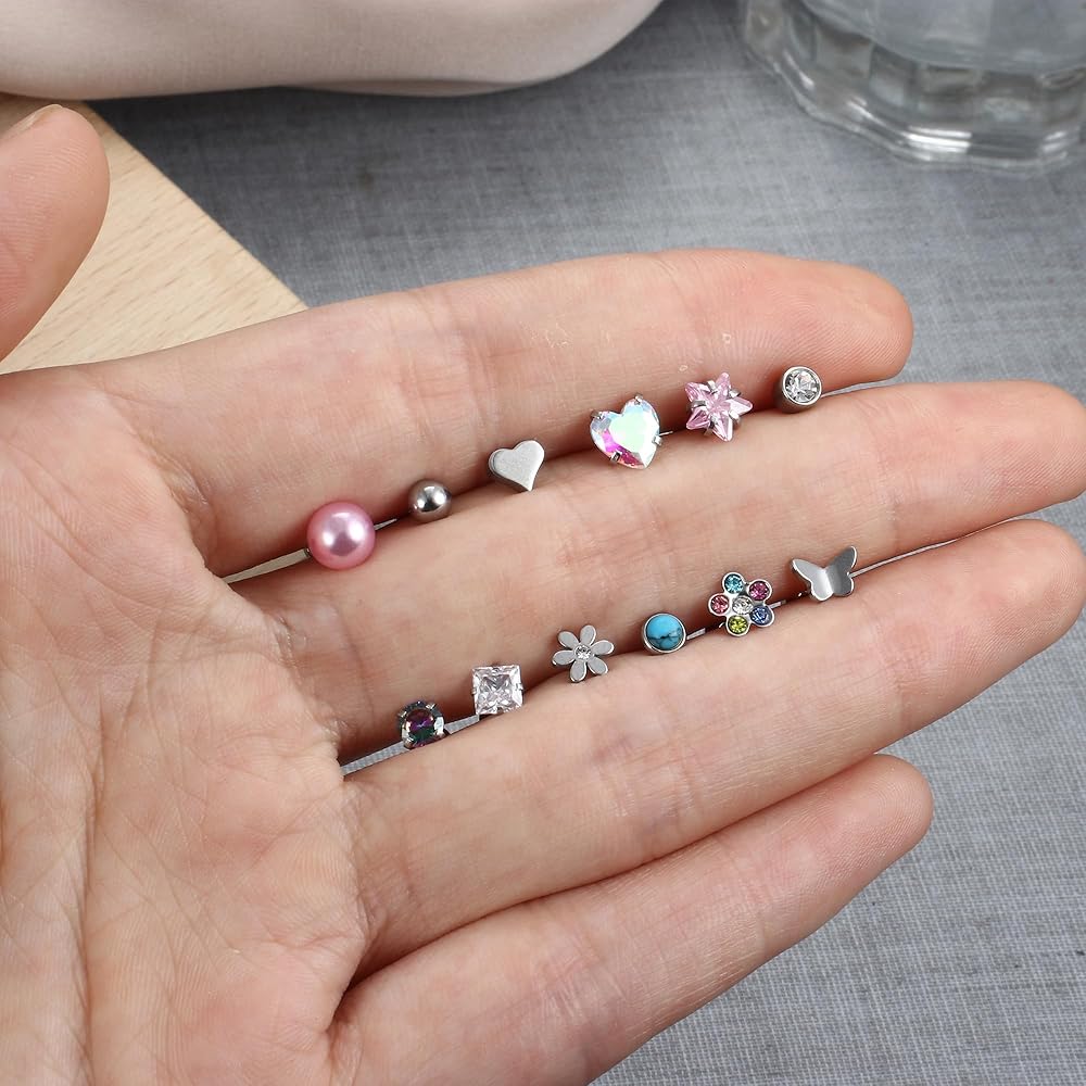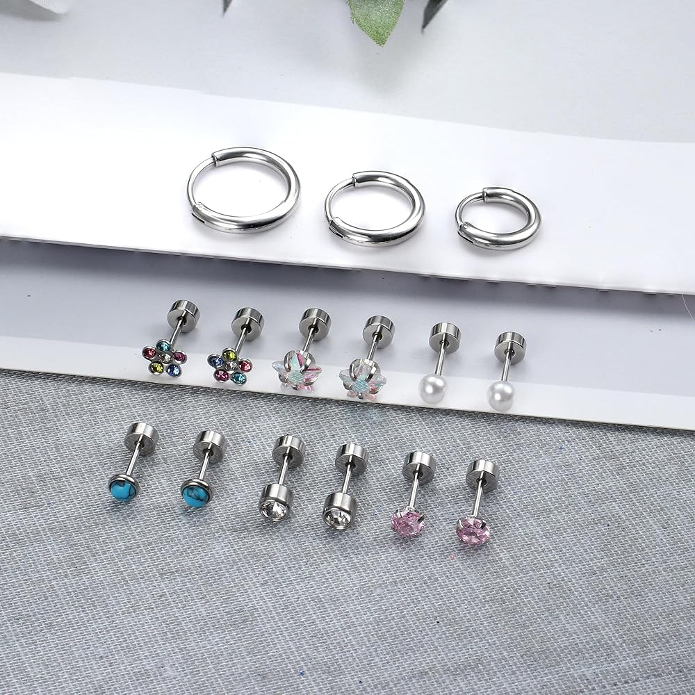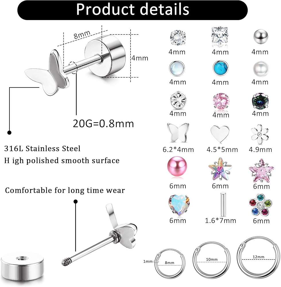 【SIZE】Stud earrings gauge:20G(0.8mm) pin thickness, Post Length:6mm,flatback size:4-6mm.The diameter of hoop earrings:8/10/12mm,gauge:18G(1mm).Cartilage earrings studs for cartilage tragus daith helix ear piercing.