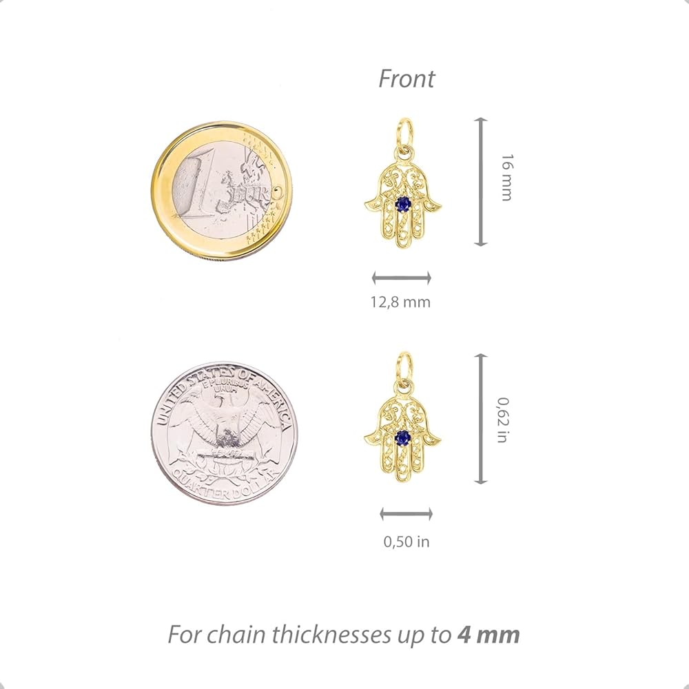The Hamsa / Hamsa Hand of Fatima is a symbol of protection and good luck, making this piece of jewellery a meaningful and thoughtful gift for a loved one. The 2.5mm natural sapphire adds a touch of sparkle and charm to the design, making it a truly eye-catching piece. 14K yellow gold is a classic and timeless choice, ensuring this piece will never go out of style.