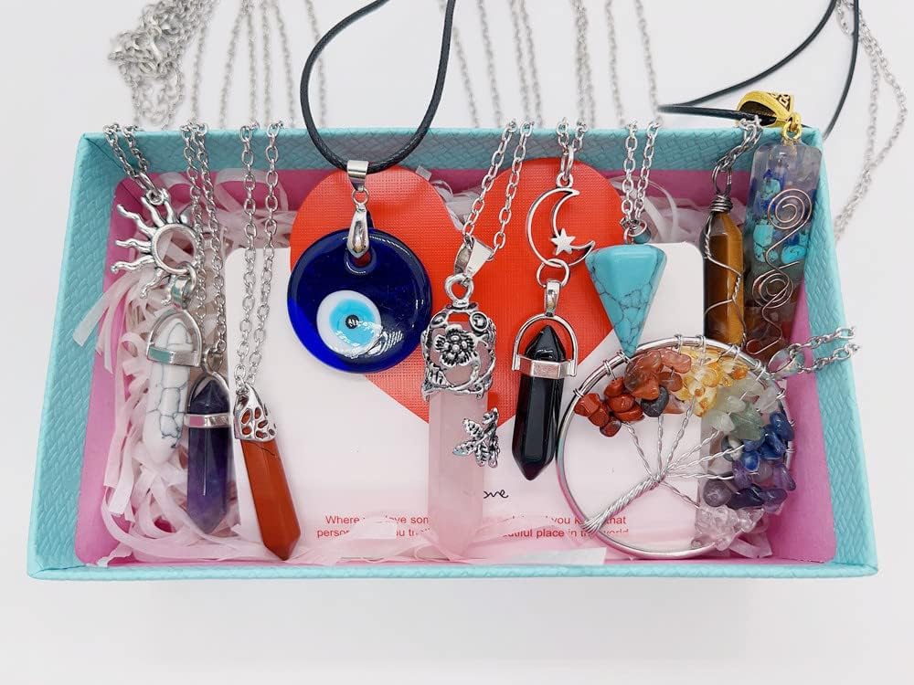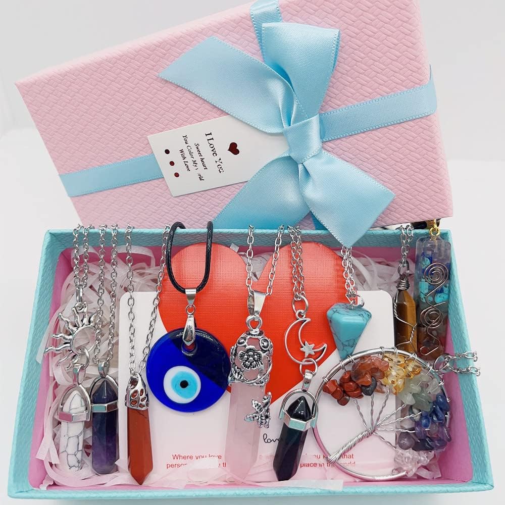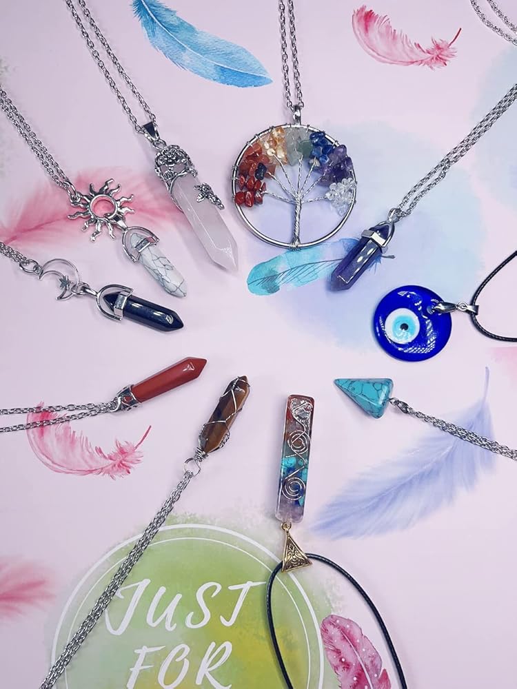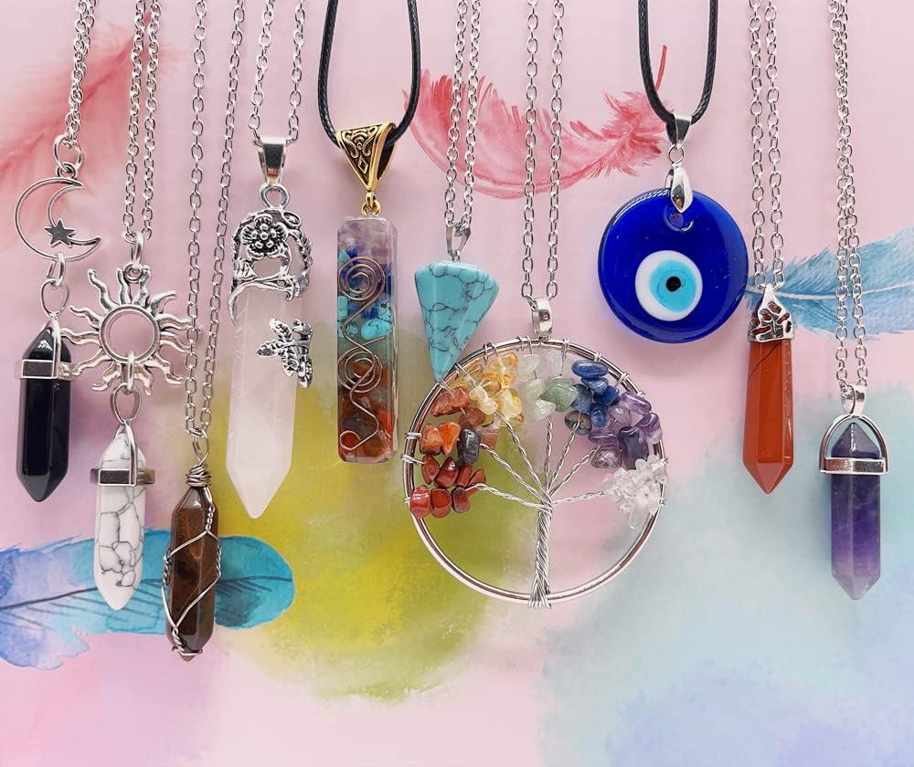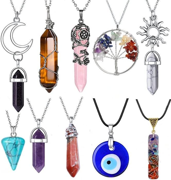 【مجموعة قلادات كريستالية من 10 قطع】: تتضمن مجموعة قلادات الكريستال 7 شاكرا، قلادة العين الزرقاء، قلادة كريستال شجرة الحياة، قلادة قمر الشمس الكلاسيكية، قلادة حجر عين النمر الكوارتز الوردي، قلادة الفيروز الأزرق، قلادة العقيق، مجموعة متنوعة من القلائد الأنيقة، يمكنك مطابقتها مع أنماط مختلفة من الملابس.